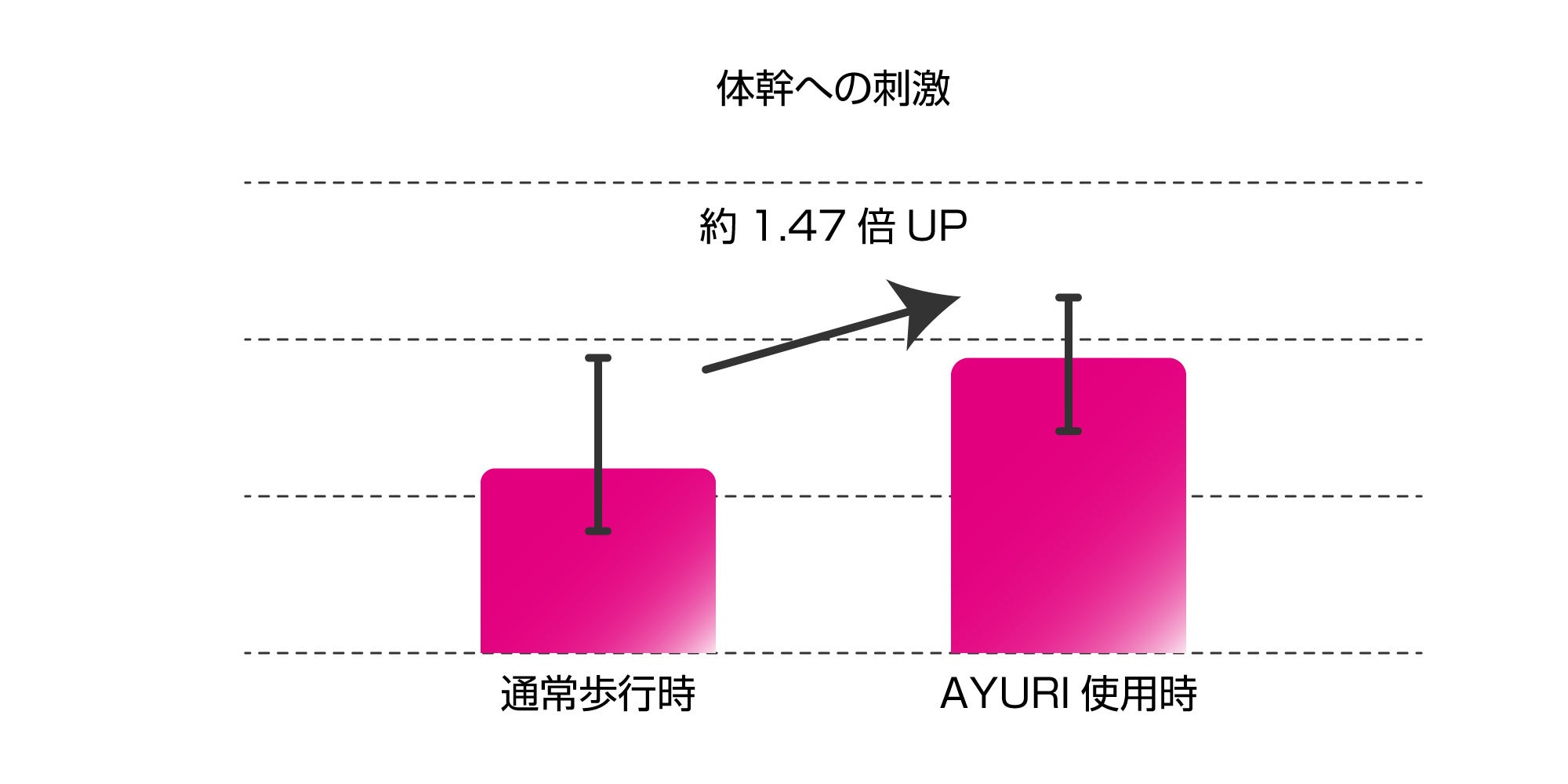下表「体幹への刺激」について、首と腰の揺れ具合を加速度計(マルチセンサー)を使用してAYURI未使用・使用時で計測しました。AYURIを使用することで体幹への衝撃の吸収度が1.47倍UPしており、美しい歩行×広がった歩幅により、適切に体幹に刺激が入り、年齢とともに気になるお腹周りを引き締める効果が期待できます。※個人差のデータの振れ幅を黒い縦線で表しています。