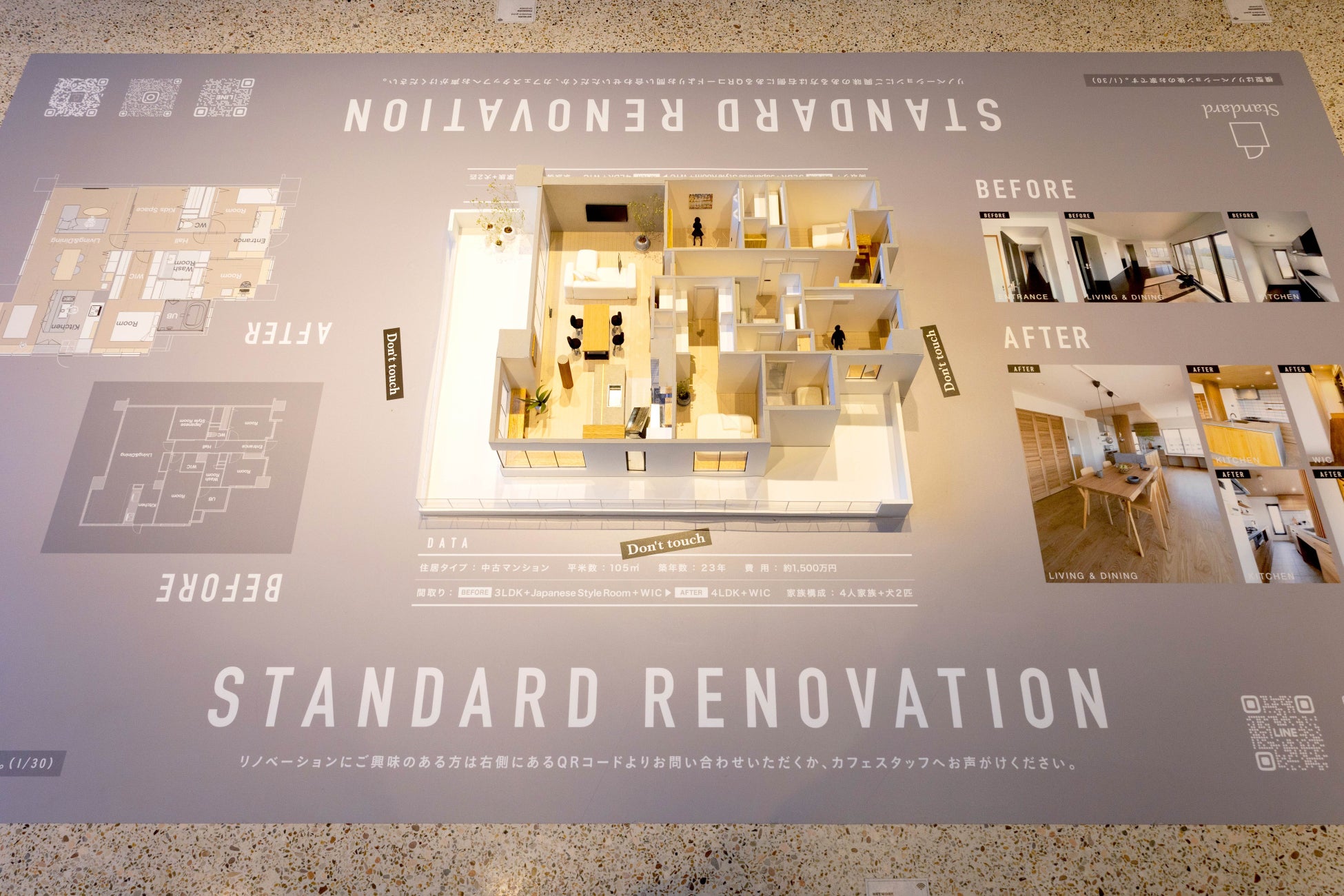 大阪を拠点に空間プロデュースを行う株式会社Standardがこれまでの施工事例をパネル展示。時代の変化と共に変わる生活スタイルを映し出すような、これまでの施工事例を回覧する事ができます。また、リノベーション費用もわかるので、リノベーションを考え中や将来お考えの方には必見のイベントです。是非、この機会にカフェと併せて訪れてみてはいかがでしょうか?