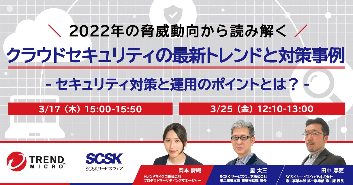 SCSKサービスウェア株式会社(本社:東京都江東区、代表取締役社長:清水 康司)は、クラウド環境における最新の脅威動向とそのセキュリティ対策を紹介するセミナー「2022年の脅威動向から読み解く、クラウドセキュリティの最新トレンドと対策事例~セキュリティ対策と運用のポイントとは?~」を2022年3月17日(木)、2022年3月25日(金)の2日間開催する。*いずれの日程も同内容