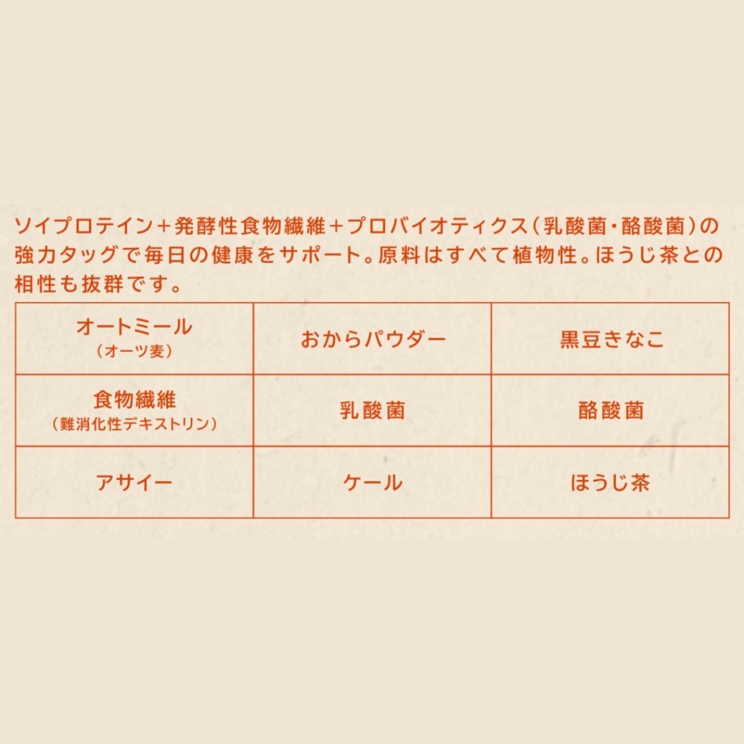 粉末状大豆たんぱく(国内製造)、デキストリン、ほうじ茶、おからパウダー、オーツ麦パウダー、黒豆きな粉、難消化性デキストリン、乳酸菌(殺菌)、アサイーエキス未、ケール未、酪酸菌/甘味料(ステビア)、(一部に大豆、乳成分を含む)