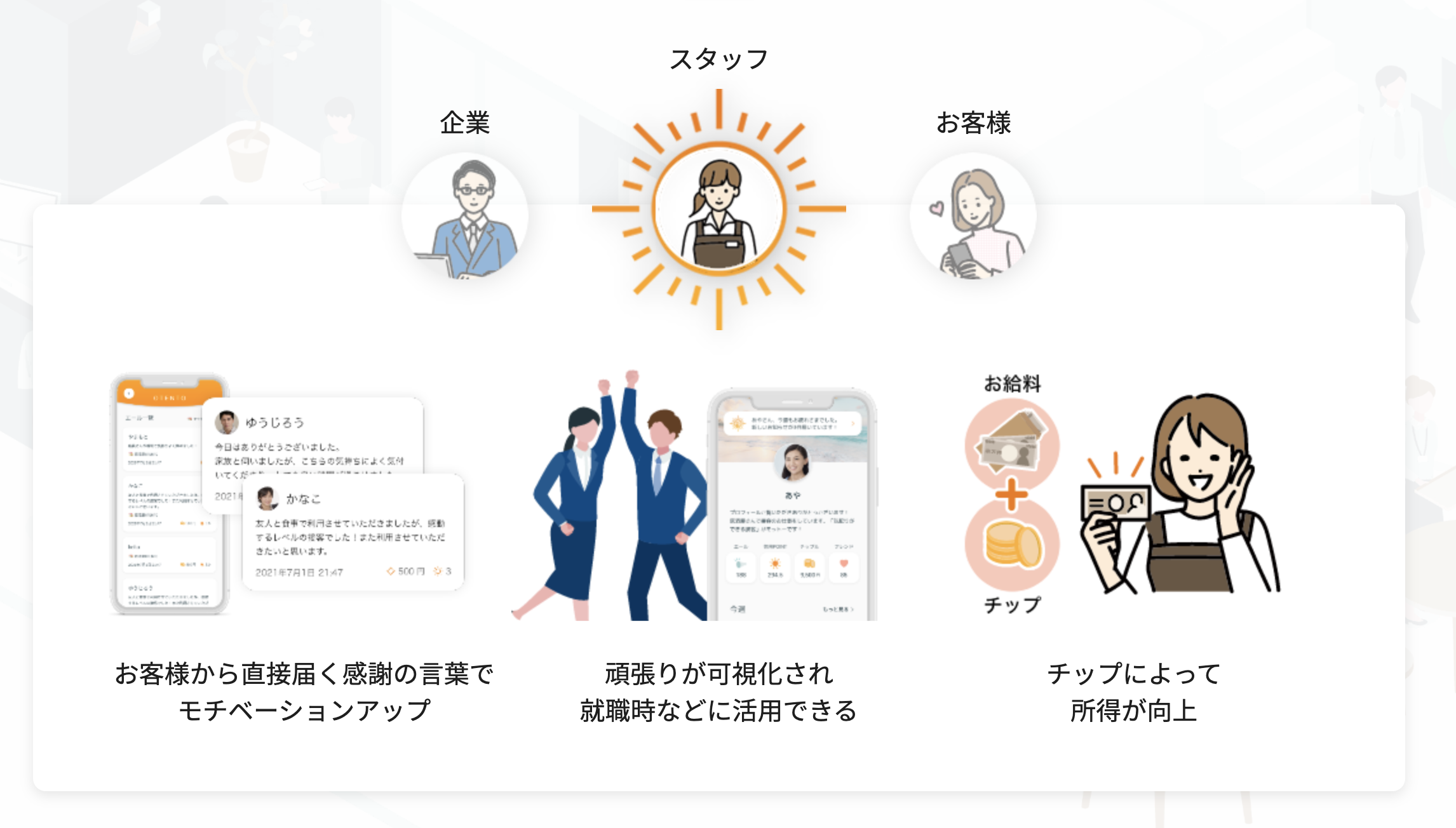 お客様は店内のQRコードを読み取ると出勤している接客スタッフの一覧表が確認でき、担当スタッフに対して「エール」という好評価を投稿が出来たり、感謝や応援のメッセージが贈れる。メッセージ内容や好評価の数に応じてスタッフがAIにより採点されることで、スタッフの評価が可視化されるのが特徴的。チェーン店の場合は自社内店舗及びスタッフの社内ランキングが可視化されることで、人事評価や表彰制度に役立てることができると好評をいただいている。