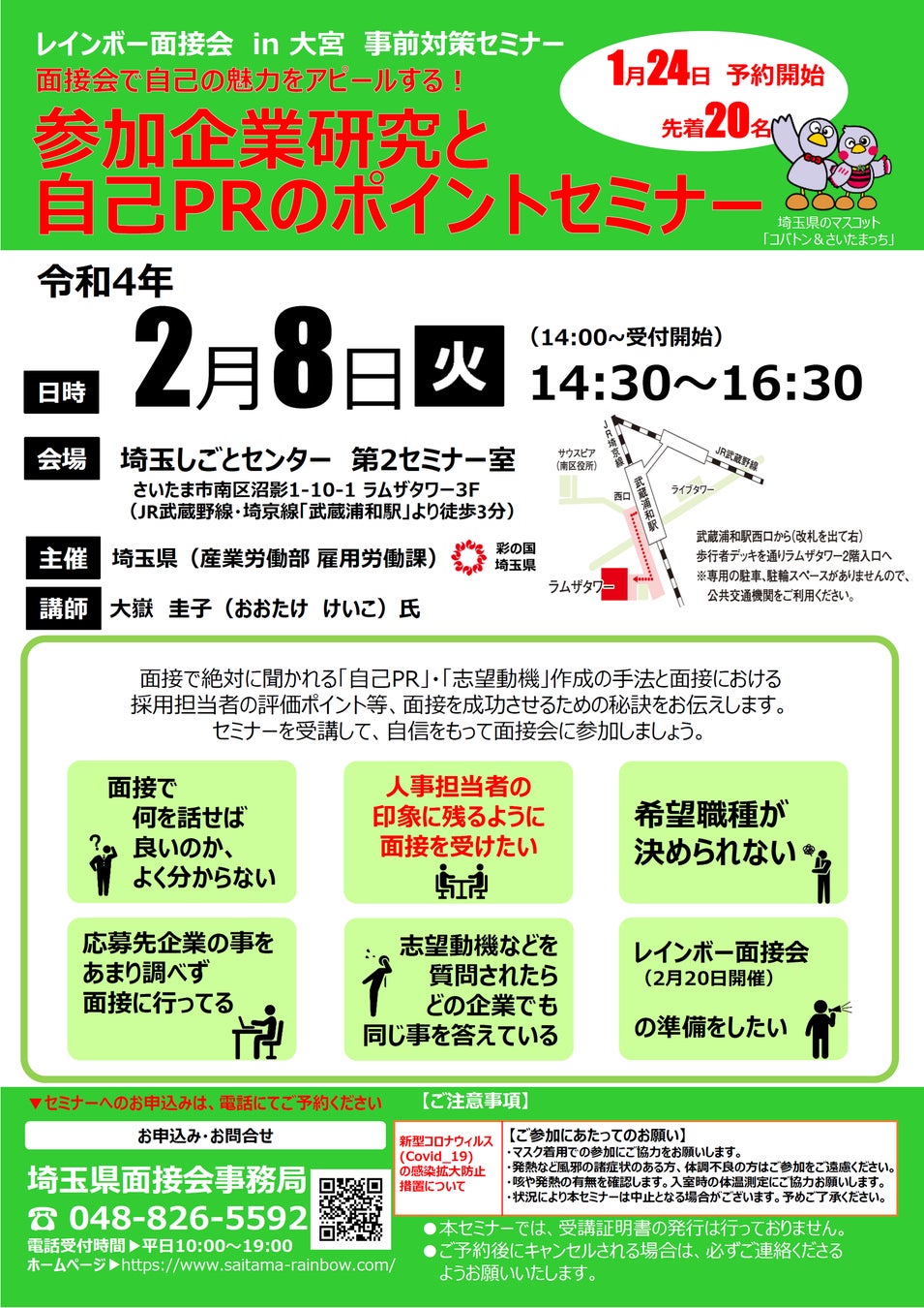 | 会場 | 埼玉しごとセンター 第2セミナー室 〒336-0027 埼玉県さいたま市南沼影1-10-1ラムザタワー3F JR埼京線・武蔵野線「武蔵浦和駅」西口より徒歩3分 |