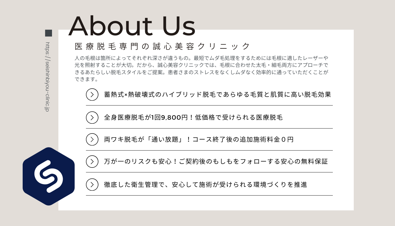 誠心美容クリニックは医療脱毛専門の美容皮膚科です。多くの女性の悩みを解決したいという思いから、最新の知見と技術を常に追求し高品質で低価格の医療脱毛の提供を目指しています。さらにきめ細やかな接遇を大切にし、追加費用を0円にする無料保証などの独自システムで、あらゆる年代の患者さまに快適な治療の提供を心がけています。「初めての脱毛は誠心美容クリニック」であるために、今後も患者さまの声に寄り添い続けます。