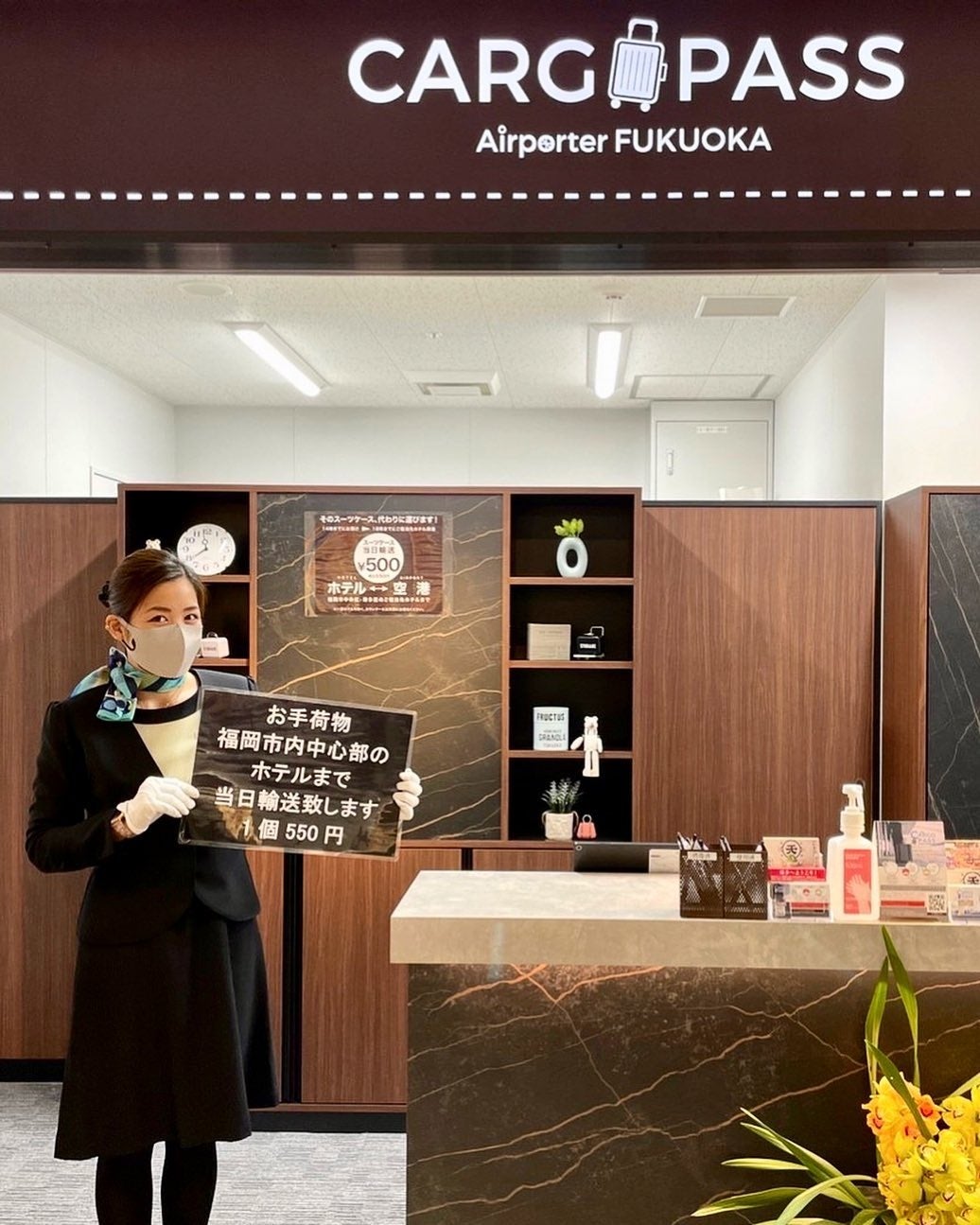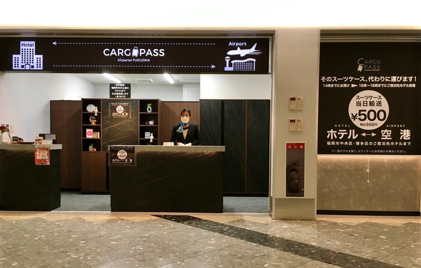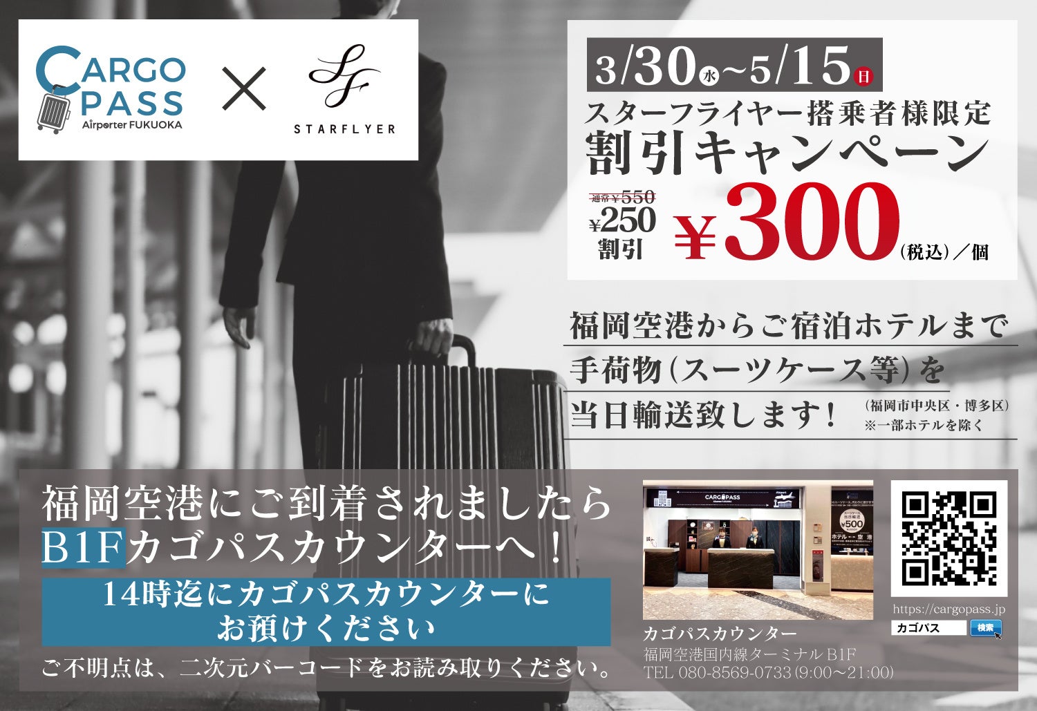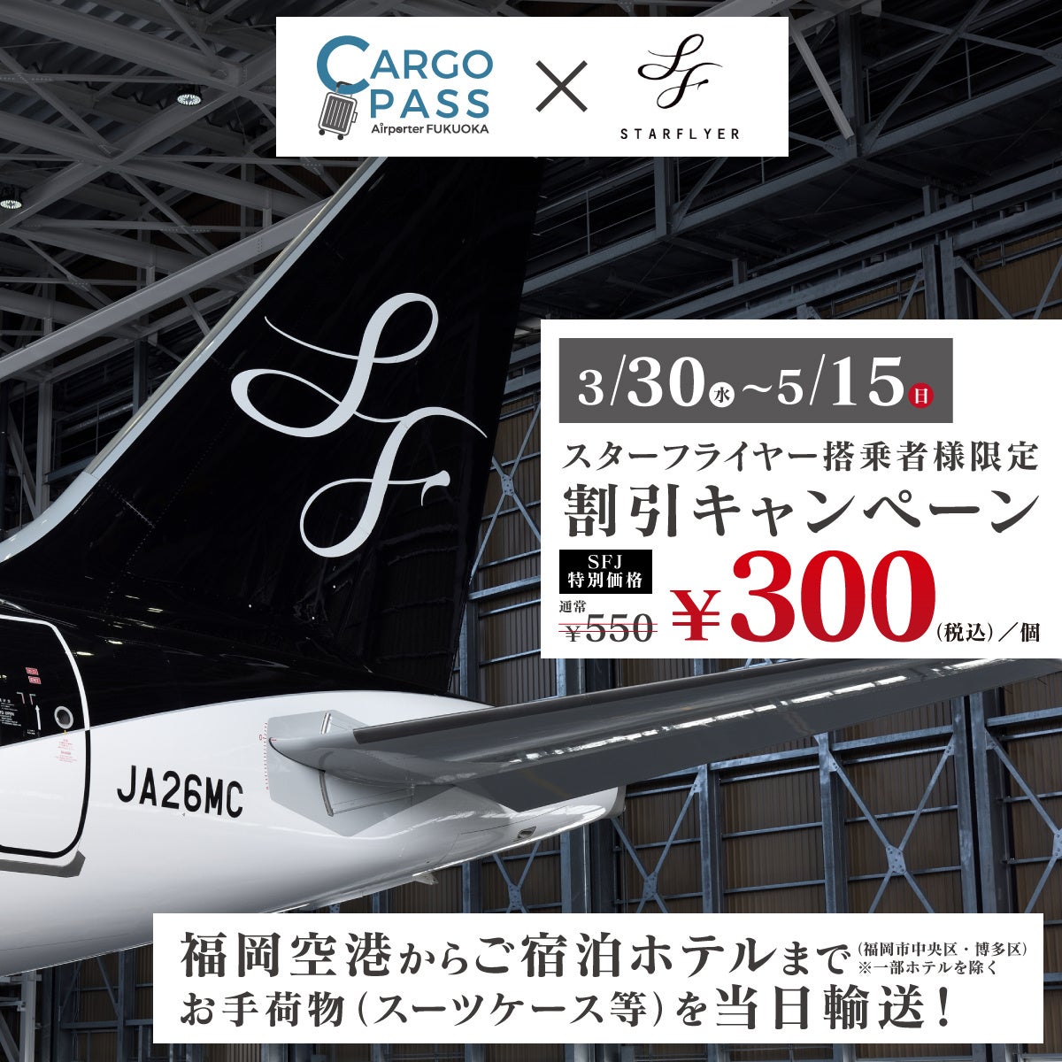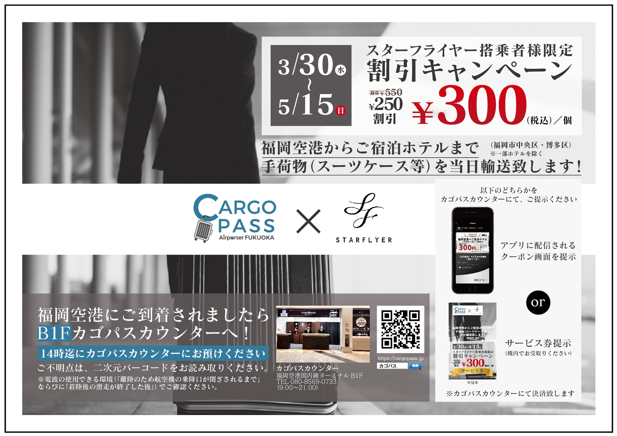 期間中に機内限定で配布するサービス券もしくは、SFJ公式アプリに配信されたアプリクーポンを福岡空港国内線ターミナルB1Fにあるカゴパス空港カウンターにてご提示いただくと、通常550円(税込)/個の手荷物配送サービスが300円(税込)/個でご利用頂けます。