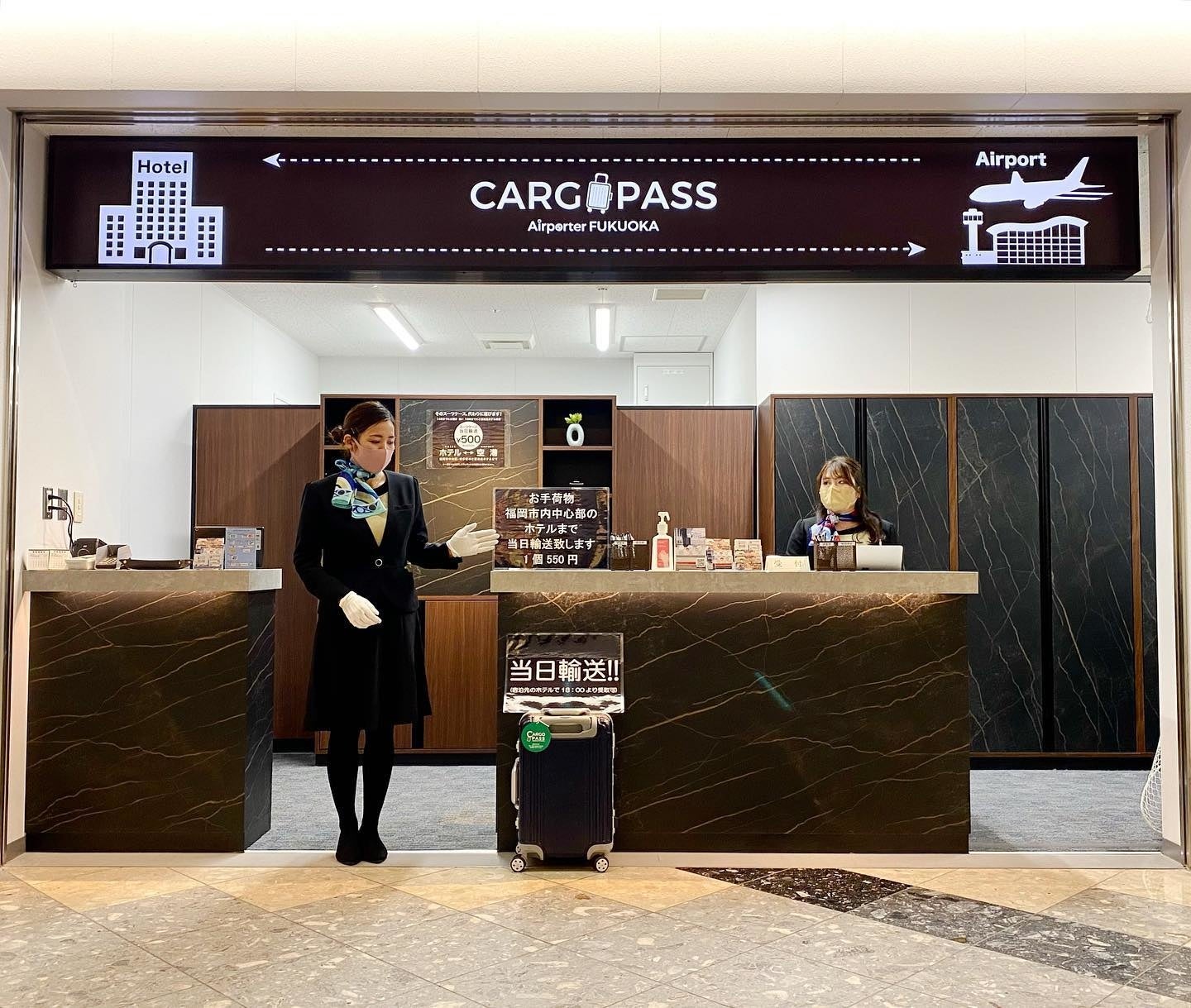 1コイン(税込550円)で、福岡空港⇆福岡市中央区・博多区のご宿泊ホテル(※一部ホテル除く)間のお手荷物当日配送サービス。