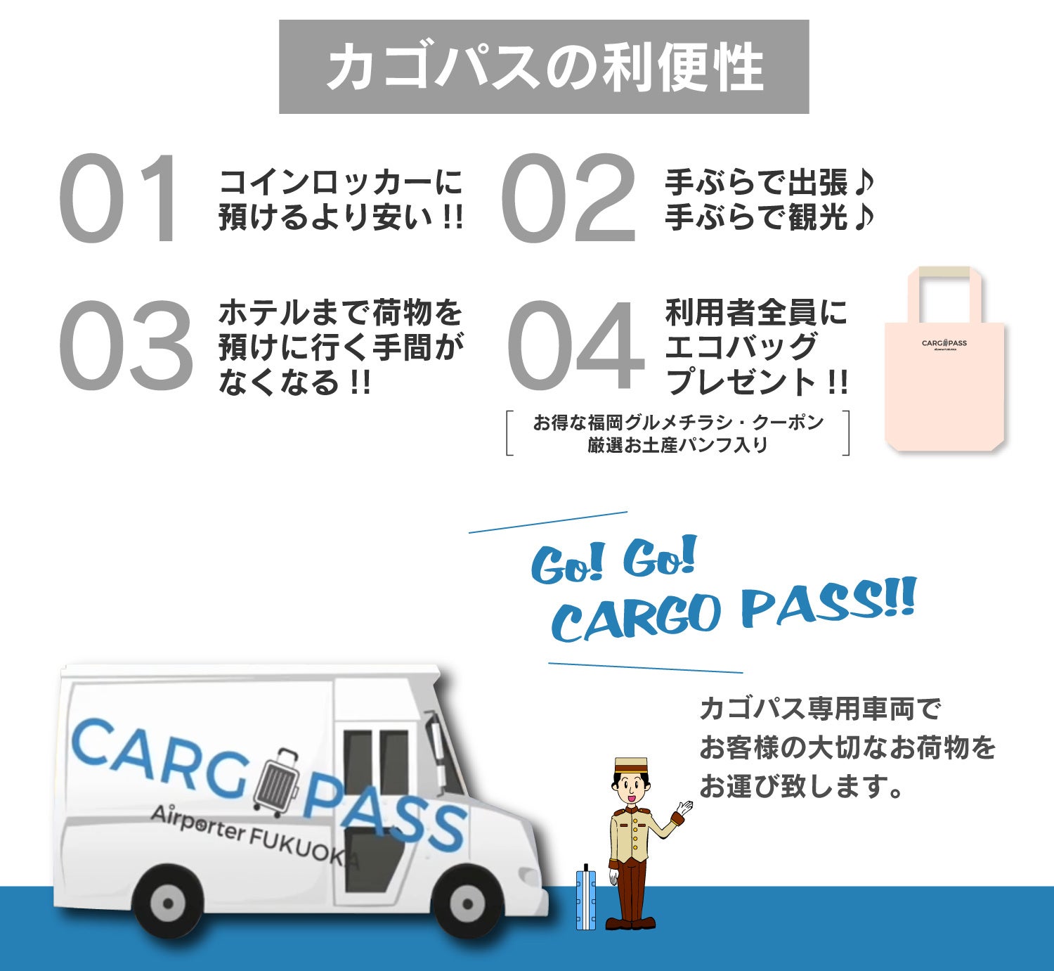 同サービスは、福岡に来られる観光客・出張者の手荷物(スーツケース等)を福岡市内(中央区・博多区)約200件のホテル様まで当日配送するサービスで「出張・観光時間を創出する」をテーマに、コインロッカーに預けるより安い料金で福岡を手ぶらで観光・出張頂ける便利なサービスです。