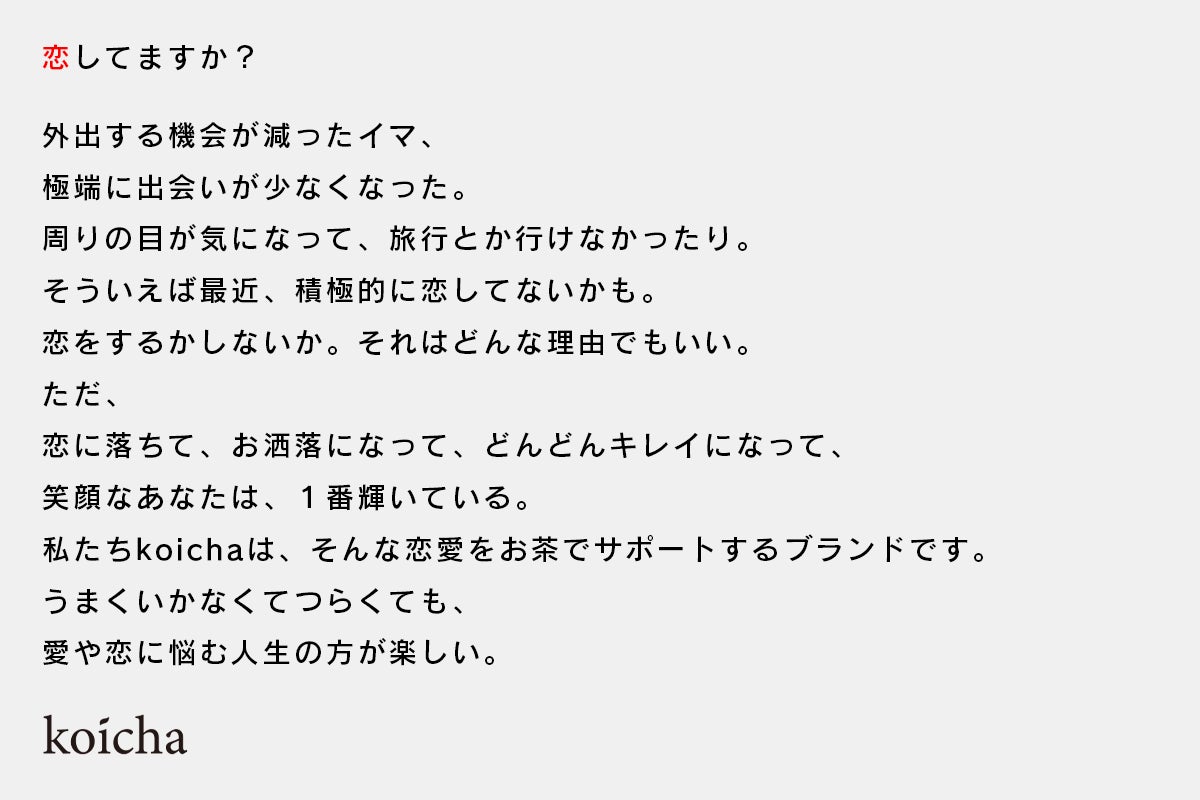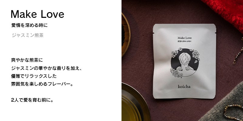 今恋をしている方はもちろん、 すでに恋人がいる方、 これから恋を楽しみたい方など、”恋”に関わる全ての方に向けたお茶のブランドです。