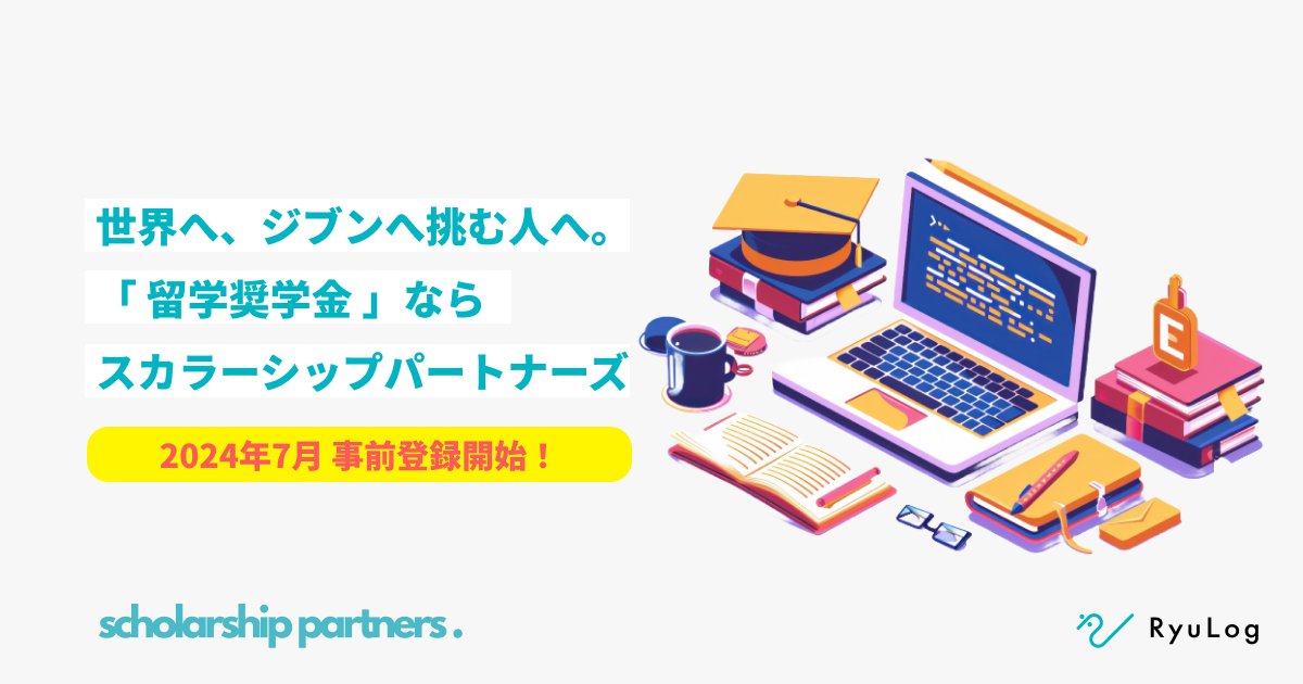 大学生の海外留学から留学後の就職キャリアまでワンストップ支援する、株式会社RyuLog(本社:東京都恵比寿、代表:平良美奈子)は、2024年7月31日より、海外留学に特化した新たな奨学金プラットフォーム「スカラシップパートナーズ」(https://lp.scholarship-partners.com/)の学生登録の受付をスタートいたします。