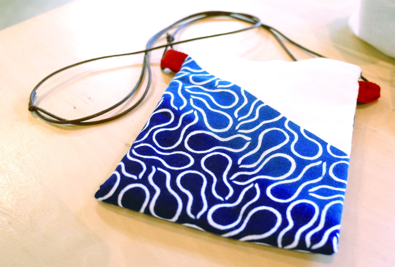 手ぬぐいを使って、お祭で使われる「千代掛け」のような、和柄の肩掛け(サコッシュ)を作ります。藍で染められた和柄の手ぬぐいで、 折り方を工夫して布を切らずに形づくっていきます。