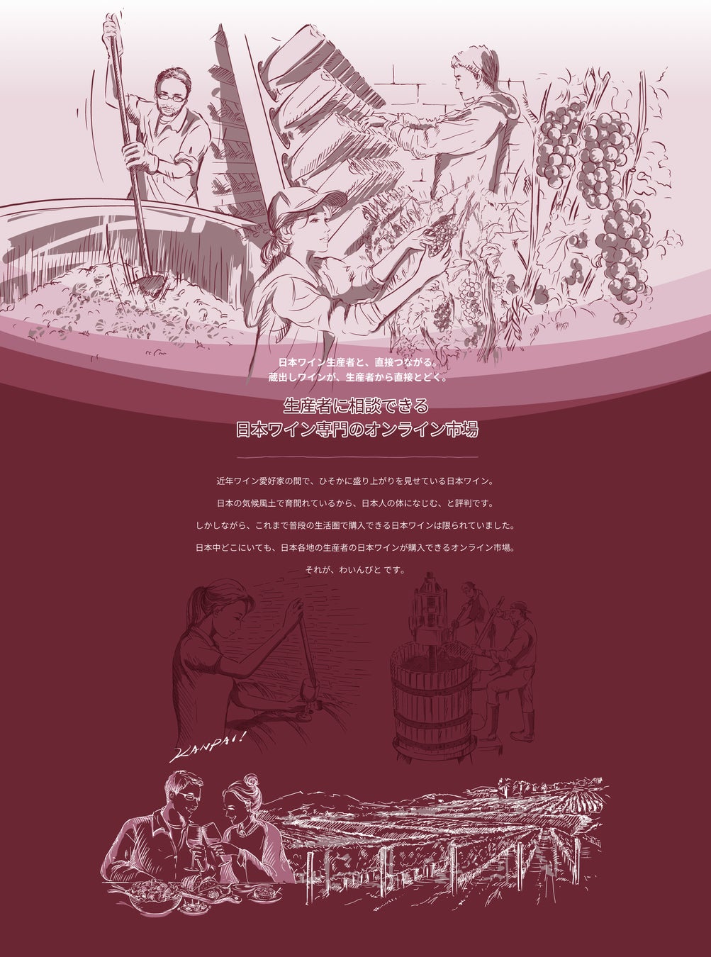わいんびとは、日本ワインを造る人も飲む人も同じく日本ワインを愛でるわいんびとであると考え、わいんびと同士を繋ぐことによって、日本ワインならではのワイン文化が育まれることを願っています。