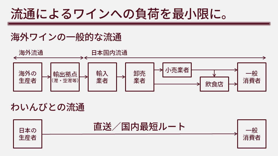 ワインはデリケートなお酒です。温度や湿度の変化、光、振動の影響を受けやすく、流通経路や輸送環境によってはワインの品質を損ねる可能性があるため、輸送時の品質管理に細心の注意が求められます。品質のよいワインを購入するためには、信頼できる流通経路を経たワインを選ぶことが重要です。たとえば、海外からの輸入ワインは様々な中間業者を経て、陸路、空路、海路など長距離の輸送を余儀なくされるため、ワインへの負荷は避けられません。わいんびとは、日本ワイン生産者からお客様に商品を直送することで流通による負荷を最小限に抑え、ワイン本来の味わいを損ねることなく国内最短ルートでのお届けを実現しました。