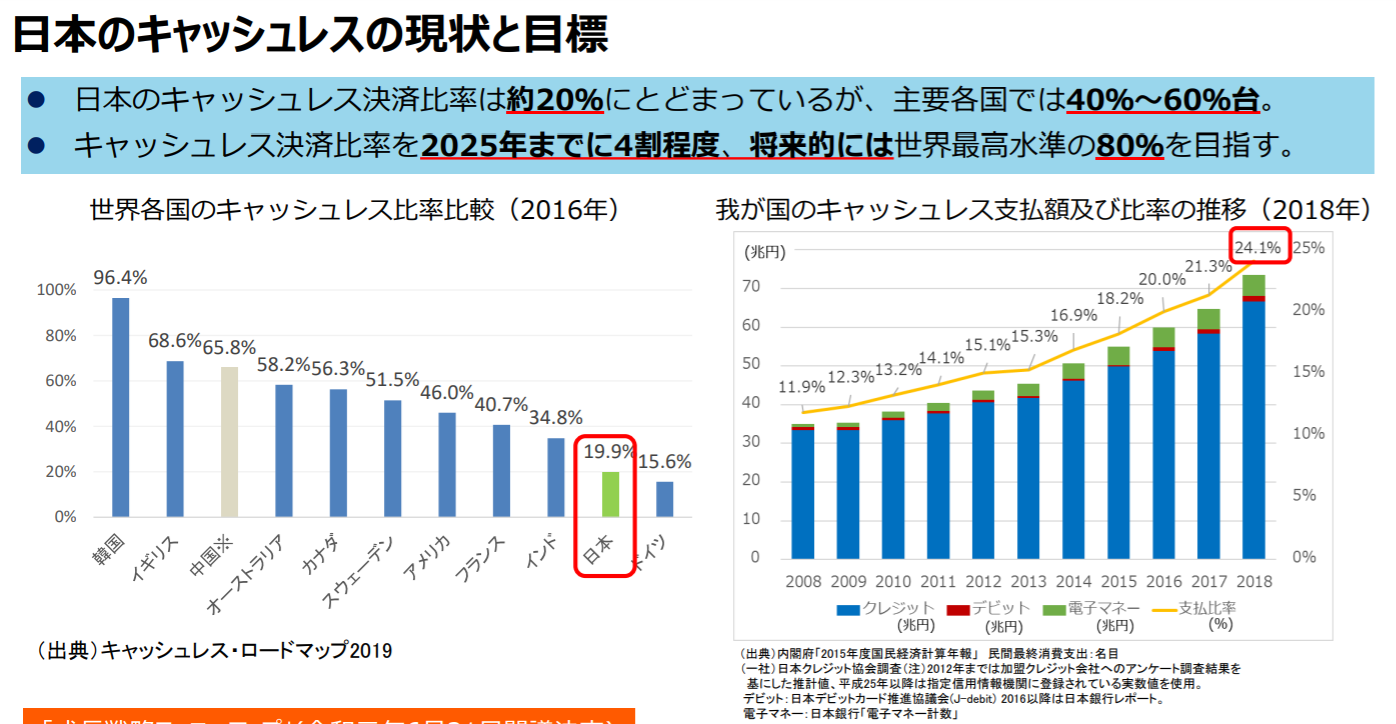 - 2025年までに国内のキャッシュレス決済比率を4割程度を目指す