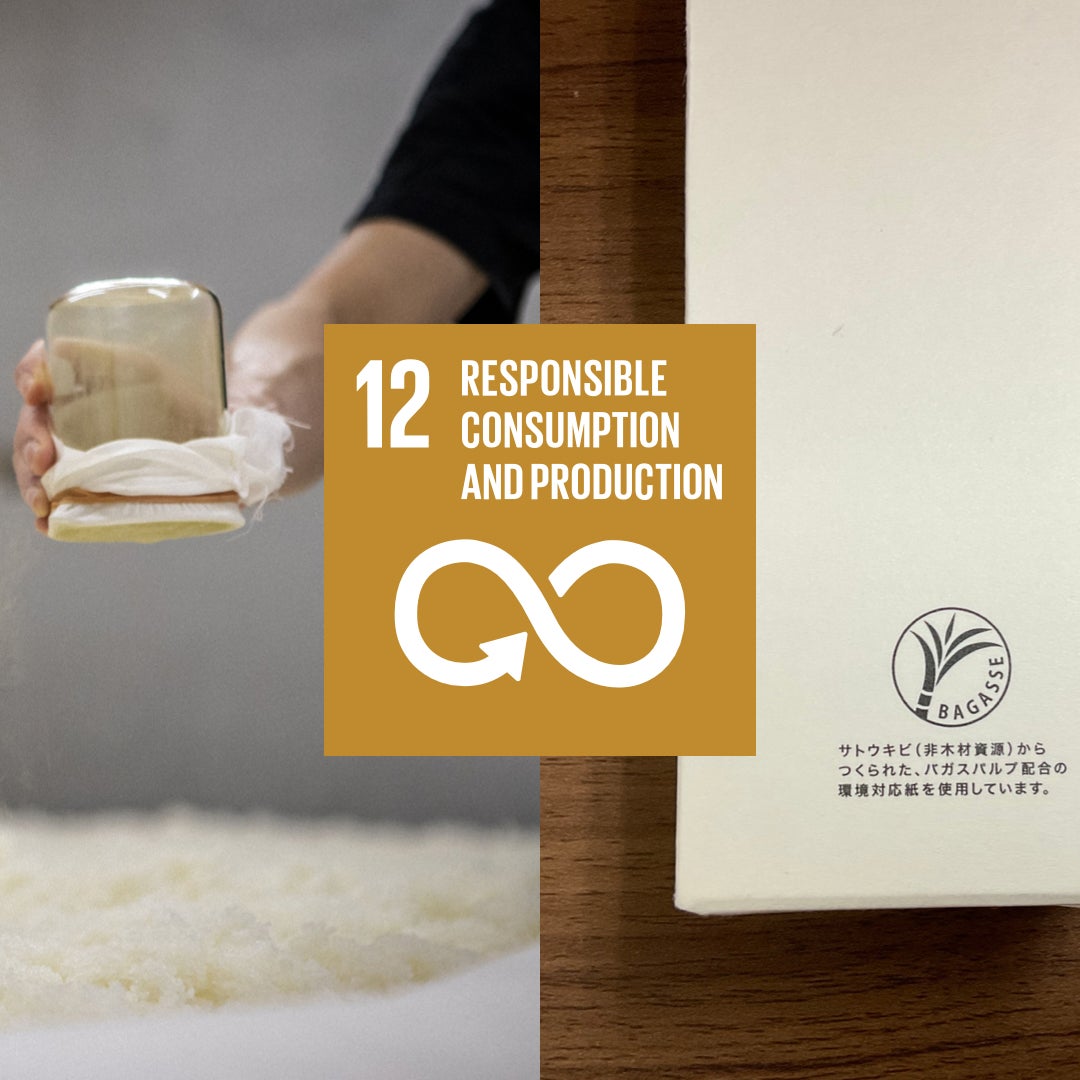 使用されるのが少なくなってきた酒粕を使い、全て自然由来のものだけを使って小学校の廃校をリノベーションした工場に委託して化粧水、美容液を作りました。使っている化粧箱もサトウキビの搾りかすをパルプにし非木材を使った紙を使用しています。