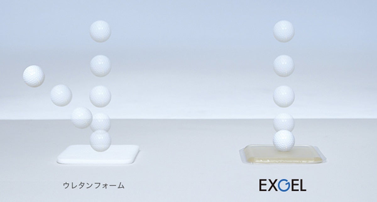 「エクスジェル」は、手でつかむとおもちのように伸びる柔軟性のあるジェル素材。ただ柔らかいだけではなく弾力性にも優れ、身体を安定して支持します。低反発でも、高反発でもない、全く新しい素材「エクスジェル」は、ゴルフボールを落としても全く弾むことなく力を吸収します。