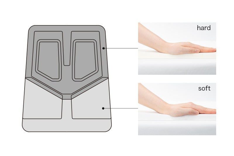 ・前後でウレタンの硬さを切り替え安定した座り心地に。お尻側は硬めのウレタンを使用し骨盤を安定させ、太腿側は柔らかめのウレタンで膝裏の圧迫を感じにくく足つきをよくしています。