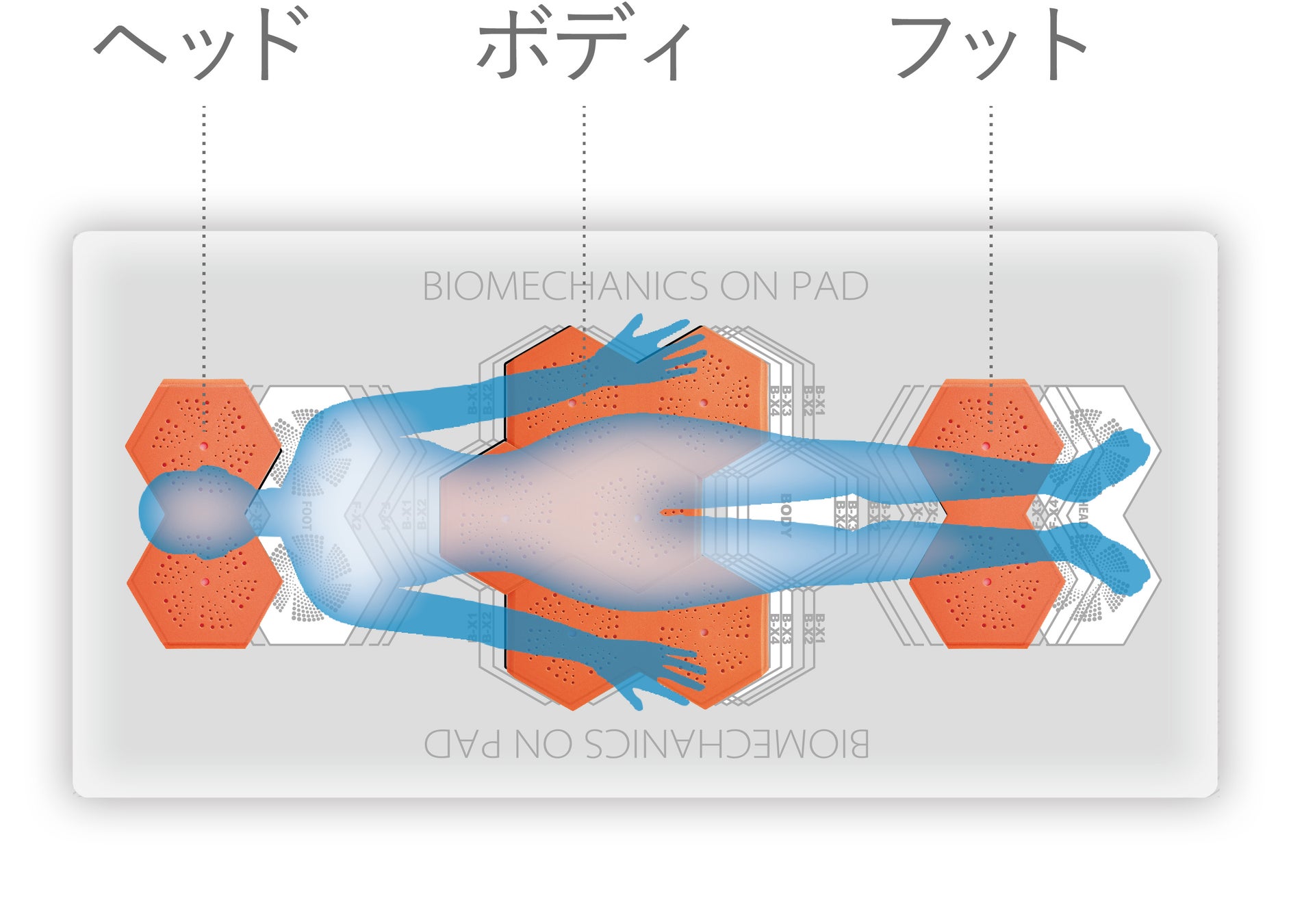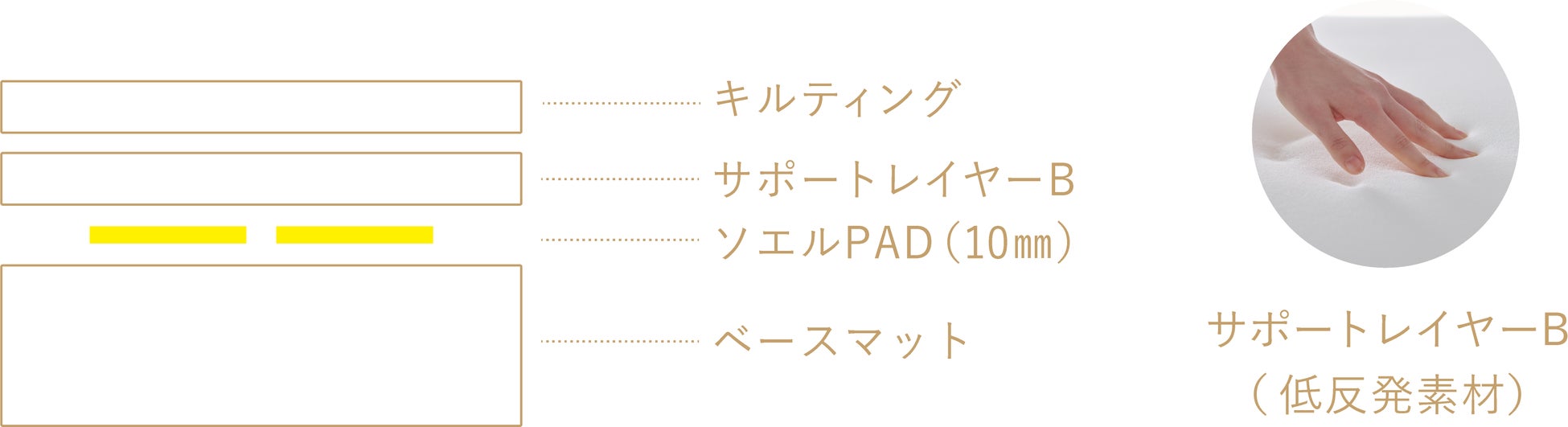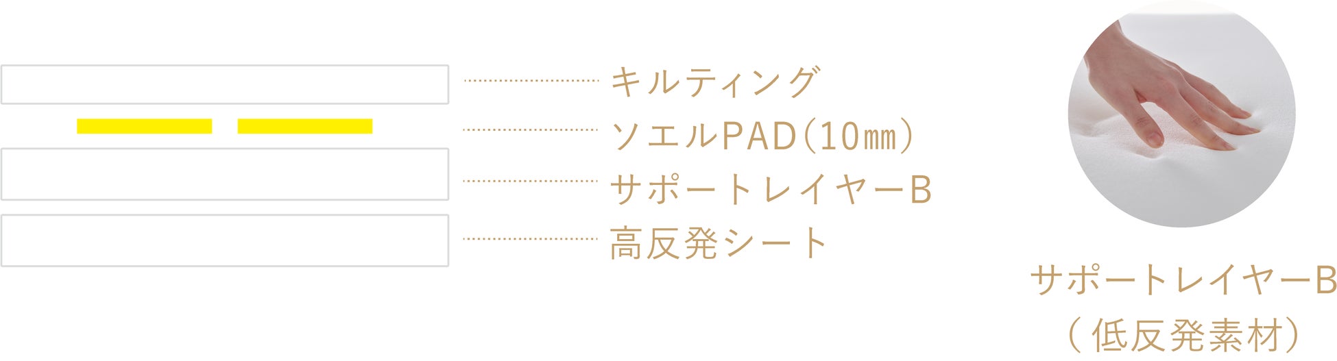 ソエルPADをヘッド・ボディ・フット部分に配置することで、体の重みを周囲に分散しながら、力が逃げないように沈み込みを抑えて支点を形成。理想の寝姿勢を保ちながら、より少ない力で無理なくスムーズに寝返りをサポートします。