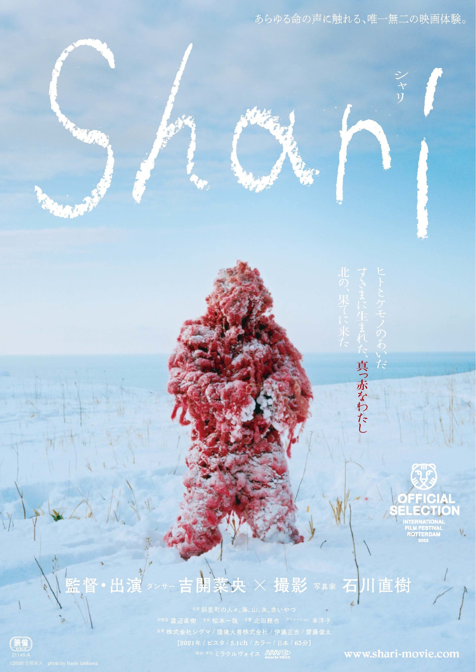 『Shari』は、監督兼「赤いやつ」である吉開菜央が、斜里町での取材を通して得た疑問や気づきを、ドキュメンタリー・フィクション・エッセイ・詩・音楽などさまざまな表現方法を組み合わせて映画にしたものです。斜里町に住む市井の人々へのインタビュー映像・音声が、監督の個人的な妄想とかけ合わさることで、土地についての断片的なエピソードが寓話的に紡がれています。それらは、あくまで監督の視点と言葉で語られていますが、客観的に見てどこまでがフィクションで、どこからが本当のことなのかが判然としないところも、また妙味です。そして、写真家の石川直樹だからこそ捉えることのできた、予定調和に収まらない偶然や奇跡に溢れた映像は、2020年の斜里町の人々の現実の生活や心根を、優しく描き出しています。