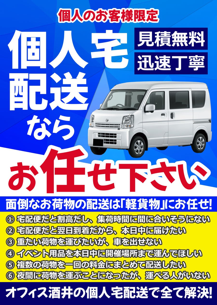 オフィス酒井(代表 酒井孝史)が展開する個人宅限定の軽貨物配送が、主にシニア層から非常に注目を集めています。業界最安値料金で、当日配送でお客様のお荷物を配送します。
