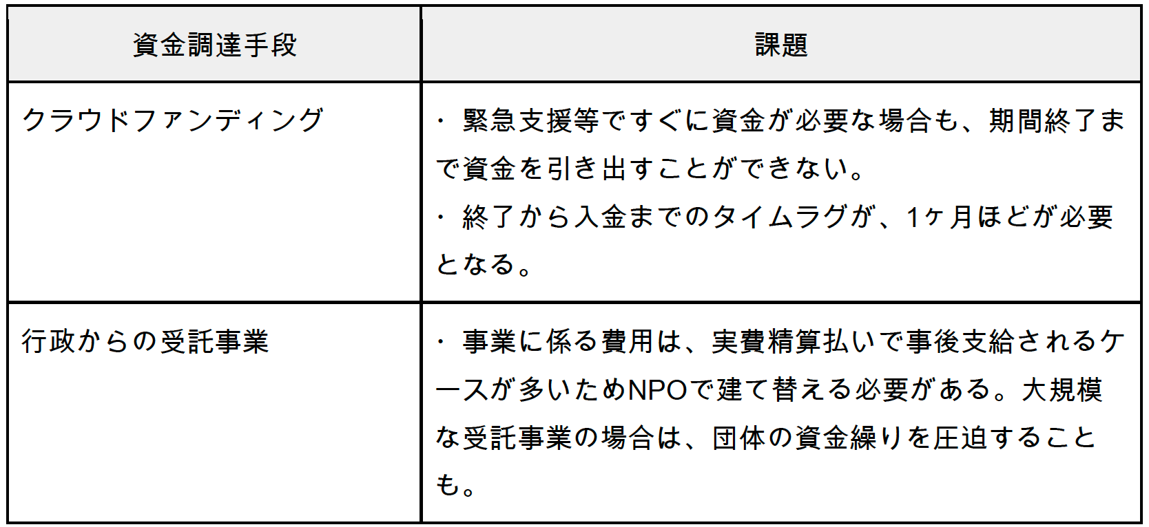 クラウドファンディングや行政からの受託事業によって、まとまった資金を獲得できる機会は増えたものの、それぞれにもスキーム上の課題が存在します。
