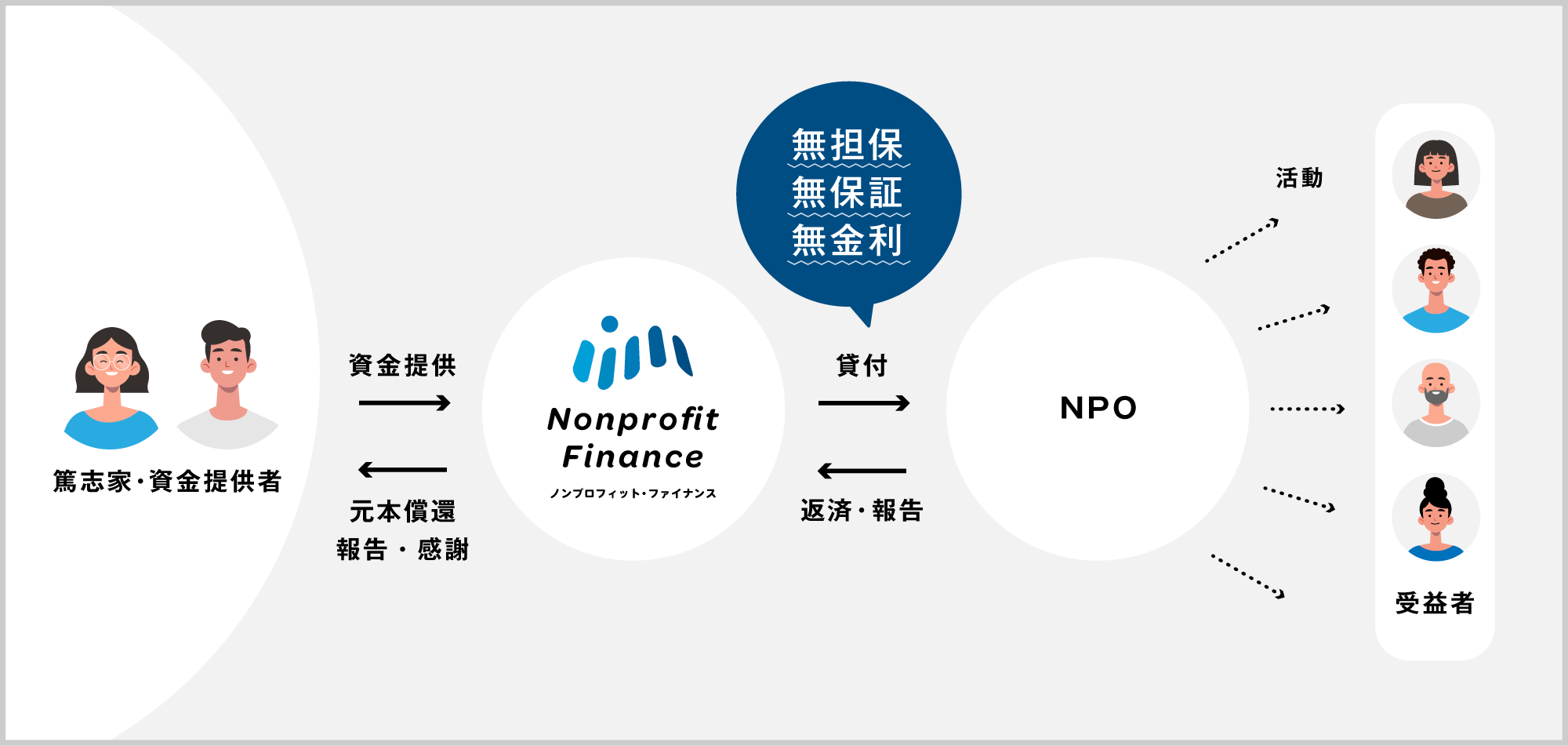 本プロジェクトは、ゼロ金利で元手を調達し、ゼロ金利でNPOへ貸し付けを行う非営利型ファイナンス事業です。