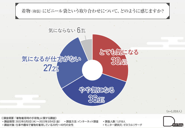 そこで、「着物(和装)にビニール袋という取り合わせについて、どのように感じますか?」と質問したところ、『とても気になる(30.4%)』『やや気になる(36.3%)』『気になるが仕方がない(27.2%)』『気にならない(6.1%)』という結果となりました。
