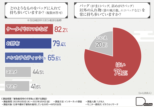 「バッグ(がま口バッグ、斜めがけバッグ)以外の入れ物(袋や風呂敷、エコバッグなど)を常に持ち歩いていますか?」と質問したところ、8割近くの方が『はい(79.2%)』と回答しました。