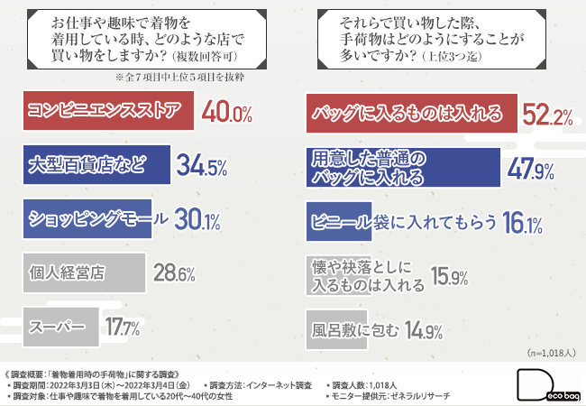 続いて、「それらで買い物した際、手荷物はどのようにすることが多いですか?(上位3つ迄)」と質問したところ、『バッグに入るものは入れる(52.2%)』と回答した方が最も多く、次いで『用意した普通のバッグに入れる(鞄、手提げ、エコバッグなど)(47.9%)』『ビニール袋に入れてもらう(16.1%)』『懐や袂落としに入るものは入れる(15.9%)』『風呂敷に包む(14.9%)』と続きました。