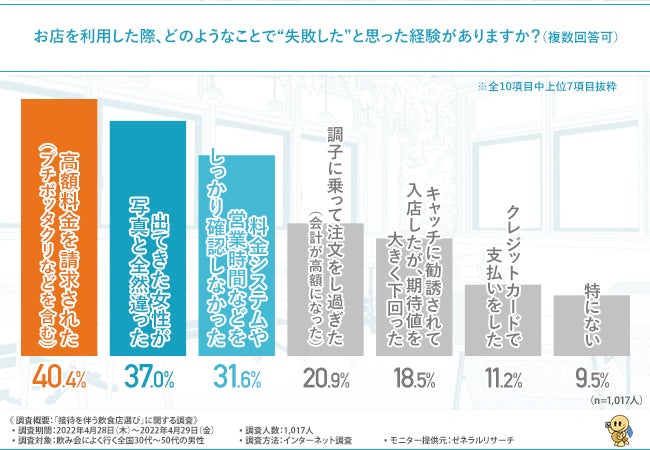 そこで、「お店を利用した際、どのようなことで“失敗した”と思った経験がありますか?(複数回答可)」と質問したところ、『高額料金を請求された(プチボッタクリなどを含む)(40.4%)』と回答した方が最も多く、次いで『出てきた女性が写真と全然違った(37.0%)』『料金システムや営業時間などをしっかり確認しなかった(31.6%)』と続きました。