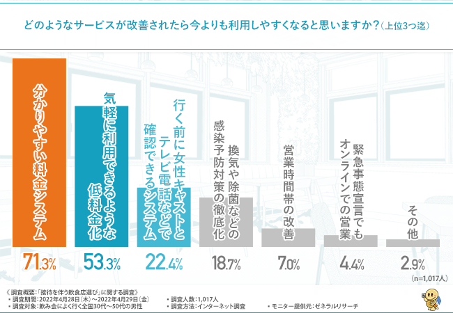 そこで、「どのようなサービスが改善されたら今よりも利用しやすくなると思いますか?(上位3つ迄)」と質問したところ、『分かりやすい料金システム(71.3%)』と回答した方が最も多く、次いで『気軽に利用できるような低料金化(53.3%)』『行く前に女性キャストとテレビ電話などで確認できるシステム(22.4%)』と続きました。