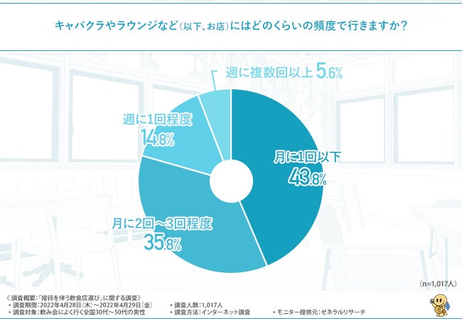 そこで、「キャバクラやラウンジなど(以下、お店)にはどのくらいの頻度で行きますか?」と質問したところ、『月に1回以下(43.8%)』『月に2回〜3回程度(35.8%)』『週に1回程度(14.8%)』『週に複数回以上(5.6%)』と回答しました。