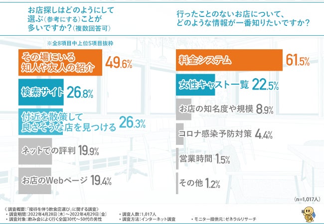 株式会社西山知材(本社所在地:東京都港区、代表取締役:西山健二)は、飲み会に良く行く全国30代〜50代の男性を対象に、「接待を伴う飲食店選び」に関する調査を実施しました。