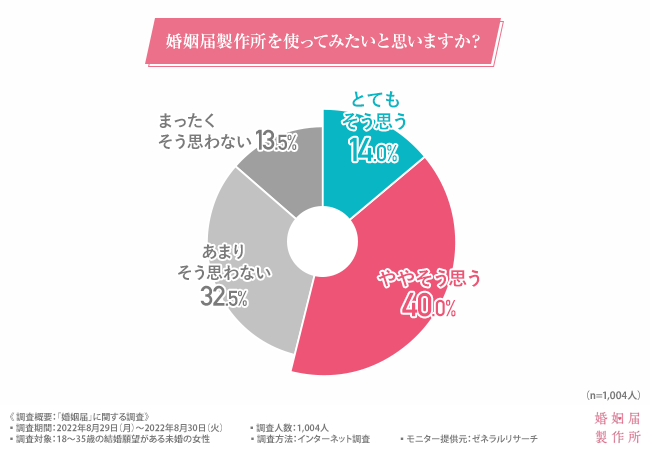 そこで、「婚姻届製作所を使ってみたいと思いますか?」と質問したところ、半数以上の方が『とてもそう思う(14.0%)』『ややそう思う(40.0%)』と回答しました。