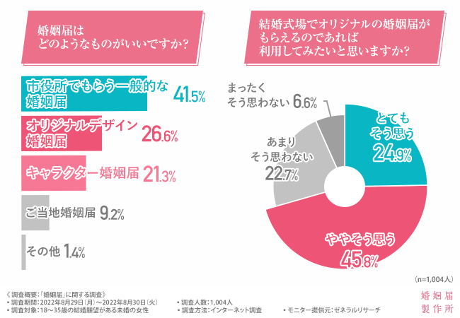 そこで、「婚姻届はどのようなものがいいですか?」と質問したところ、『市役所でもらう一般的な婚姻届(41.5%)』と回答した方が最も多く、次いで『オリジナルデザイン婚姻届(26.6%)』『キャラクター婚姻届(21.3%)』と続きました。