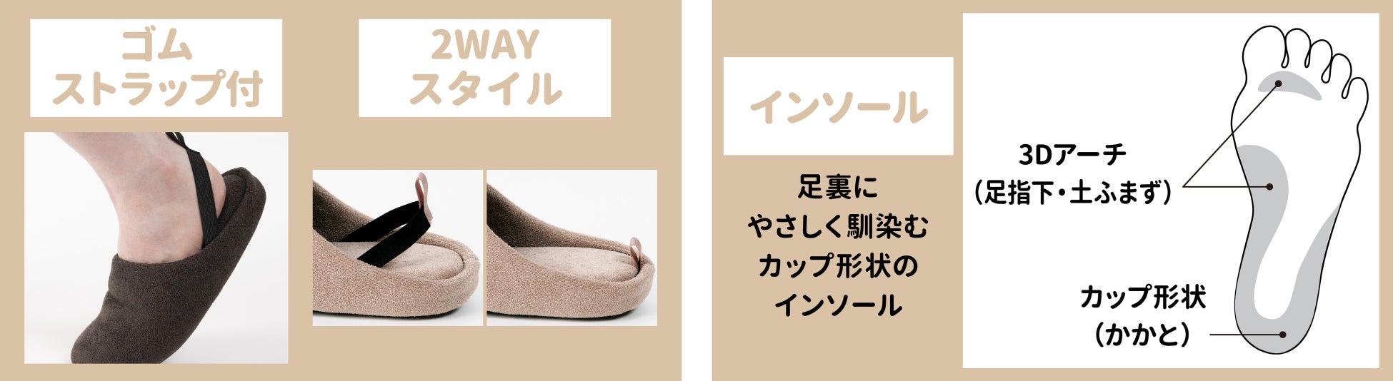同じ生地でスリッパも企画。かかとにゴムストラップ付きの2WAY仕様で、あわせて使えばさらにスマートに家事がこなせます。