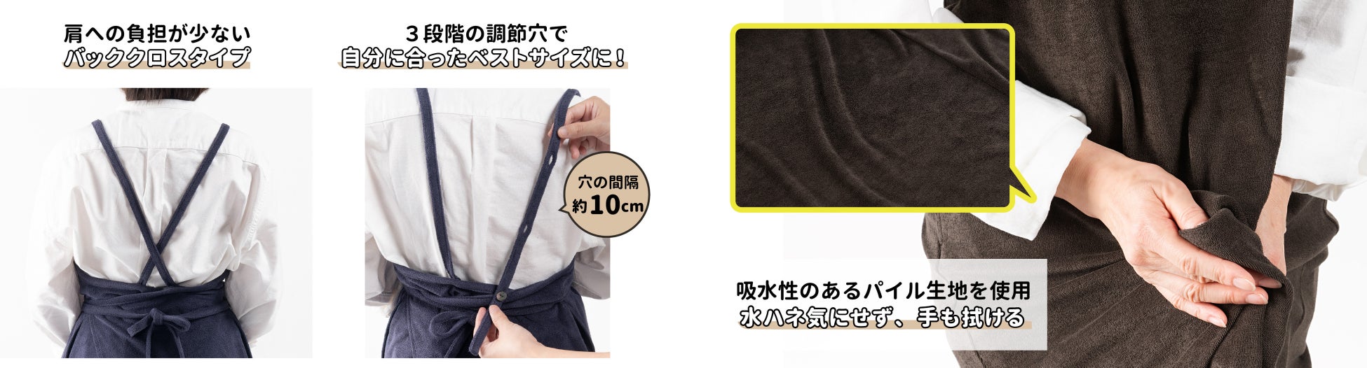 今回は、その「動きやすい伸縮性と吸水性」の優れた素材特性をエプロンに活かしています。