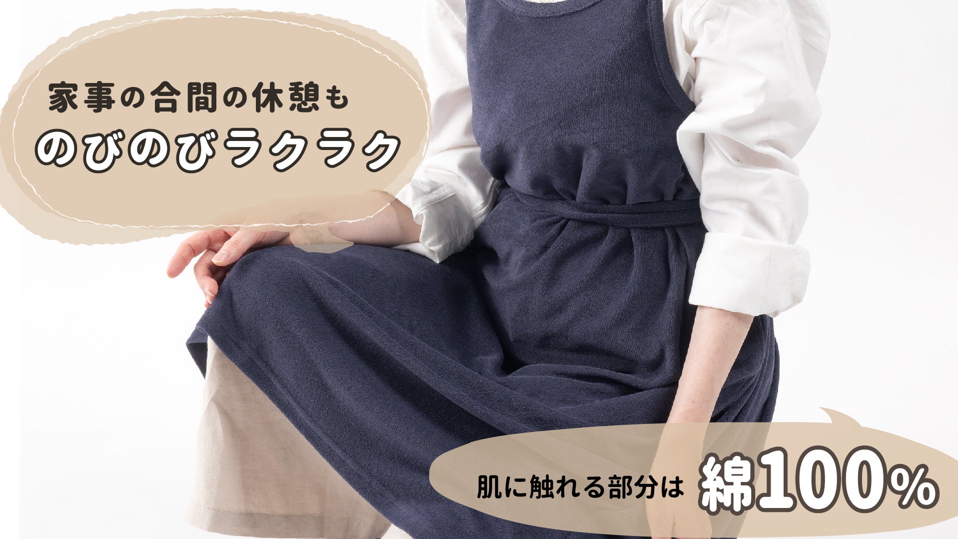 【新生活準備の強い味方】ワンピース見えのエプロンでオシャレに。リラックスウェアから生まれたから着ている方がラクラクスムーズ。なのに生活感無しのワークエプロン新登場。