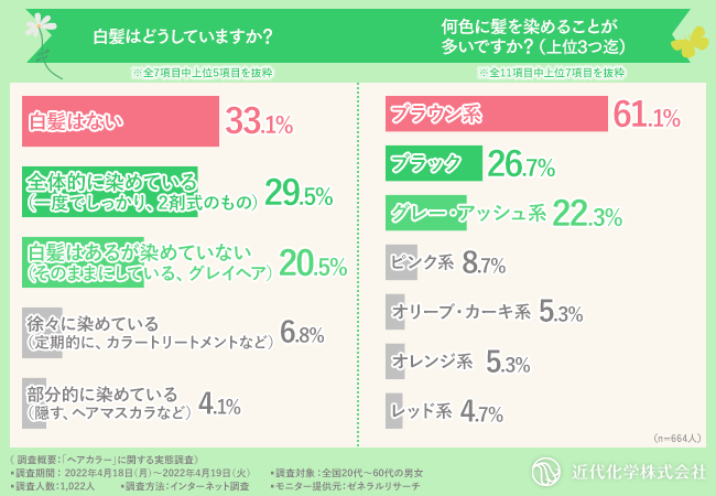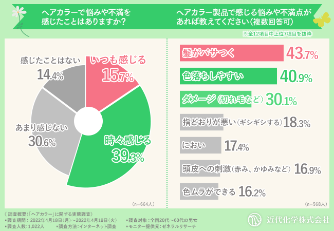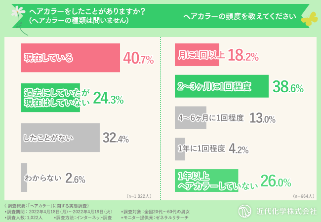 そこで今回、「ヘアケア工房」(https://www.kindaikagaku.com/)を運営する近代化学株式会社は、全国20代~60代の男女を対象に「ヘアカラー」に関する実態調査を行いました。