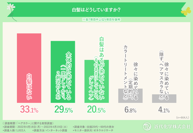 「白髪はどうしていますか?」と質問したところ、『白髪はない(33.1%)』と回答した方が最も多く、次いで『全体的に染めている(一度でしっかり、2剤式のもの)(29.5%)』『白髪はあるが染めていない(そのままにしている、グレイヘア)(20.5%)』と続きました。