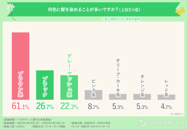 そこで、「何色に髪を染めることが多いですか?(上位3つ迄)」と質問したところ、『ブラウン系(61.1%)』と回答した方が最も多く、次いで『ブラック(26.7%)』『グレー・アッシュ系(22.3%)』と続きました。