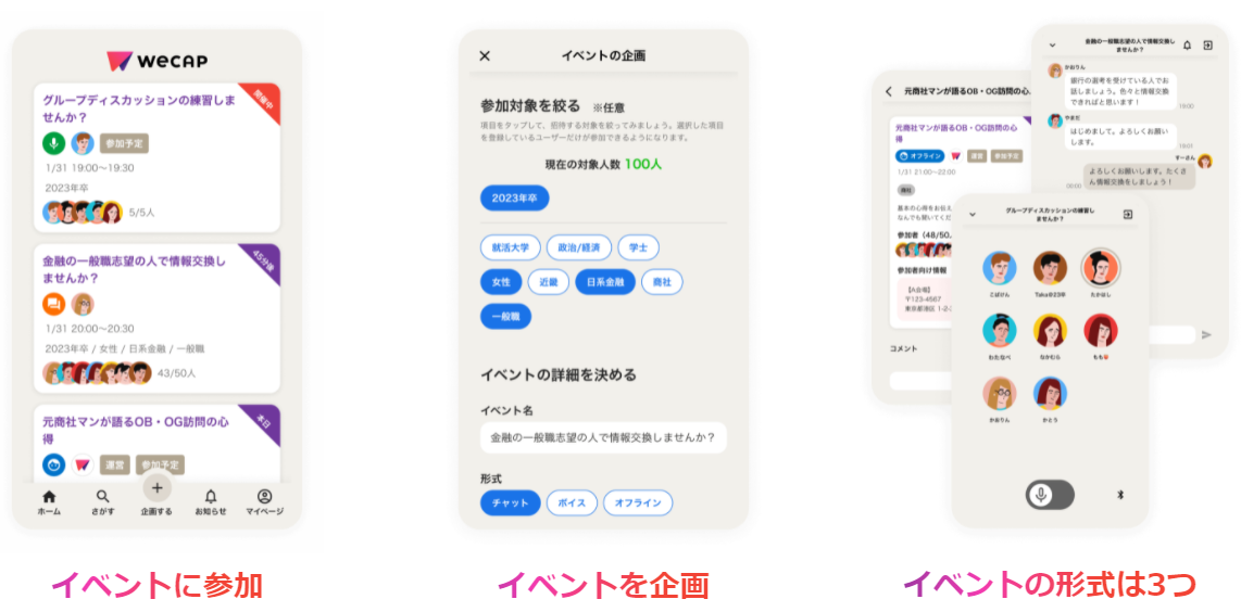 「イベント」の参加および企画により就活生同士で交流することができます。リアルタイムなコミュニケーションを前提としているため、掲示板や既存SNSなどよりも活発なやりとりが行われると期待されます。