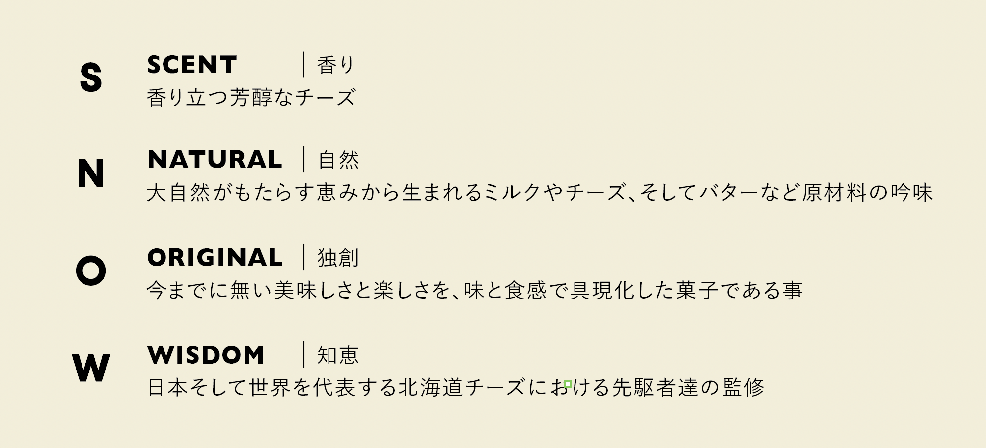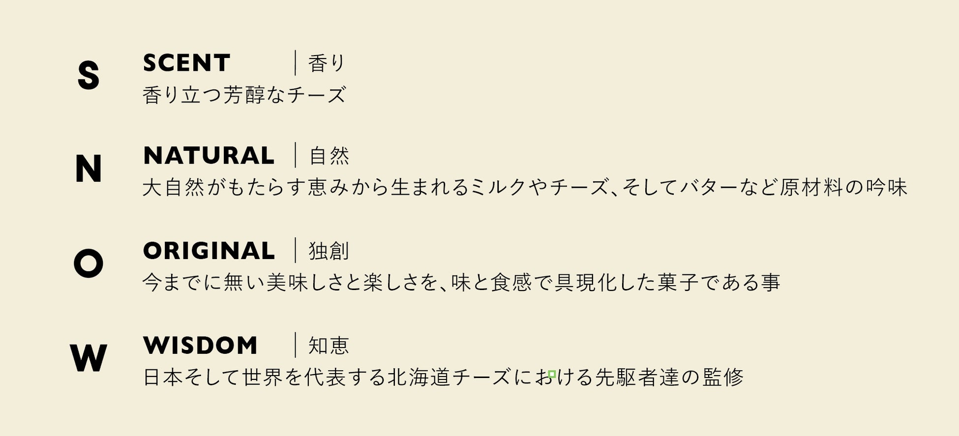 SNOWというそれぞれの文字が表す美味しさへのこだわりを、素晴らしい人々や素材との出会い、技術の進歩と共に、このお菓子に注ぎ込みました。どうぞご賞味ください。