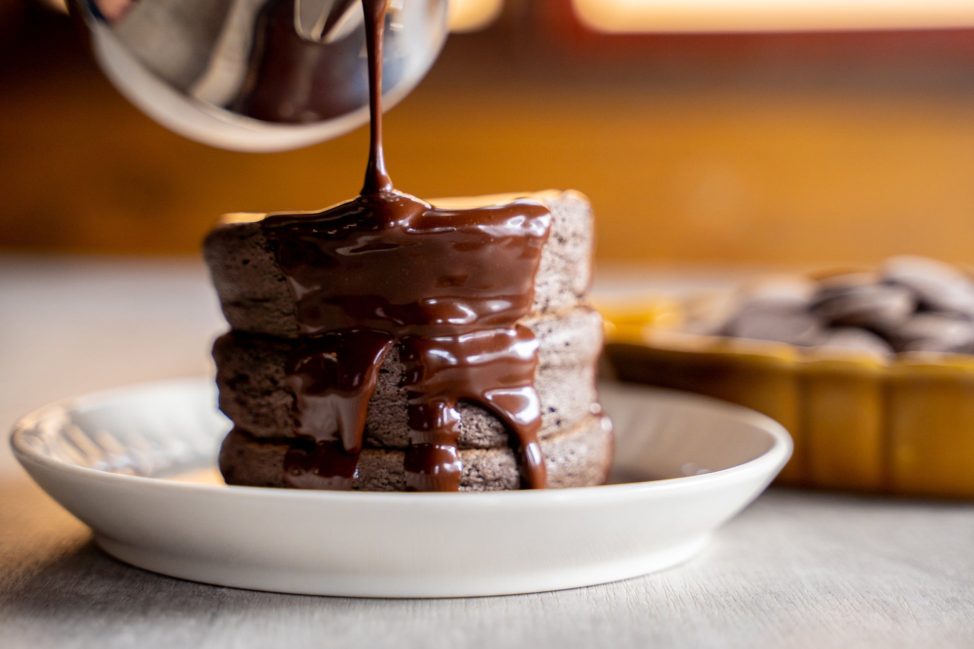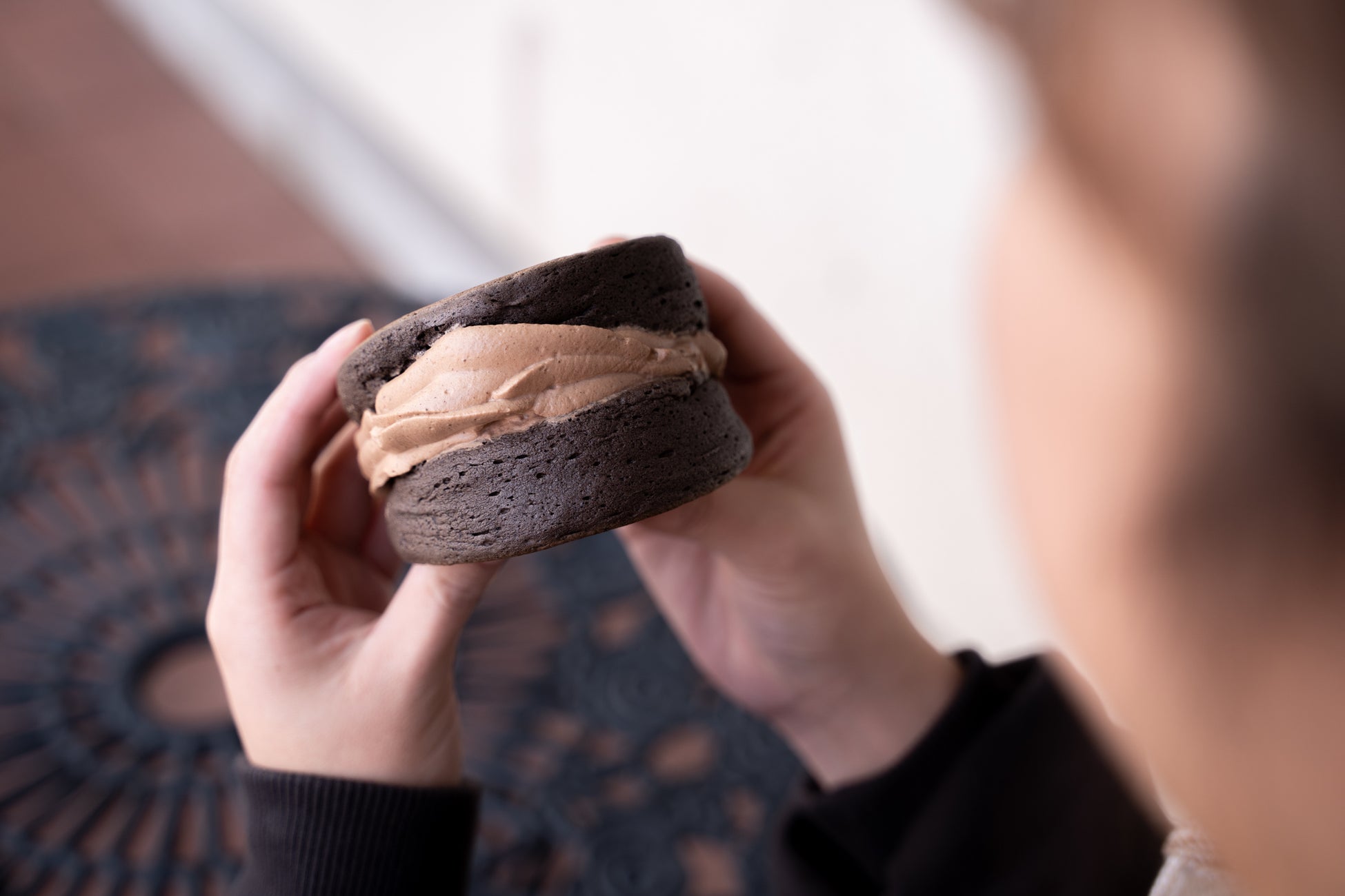 "しっとり、もっちり"としたショコラ生地とパンケーキに挟まれた特製のショコラクリームがベストマッ。