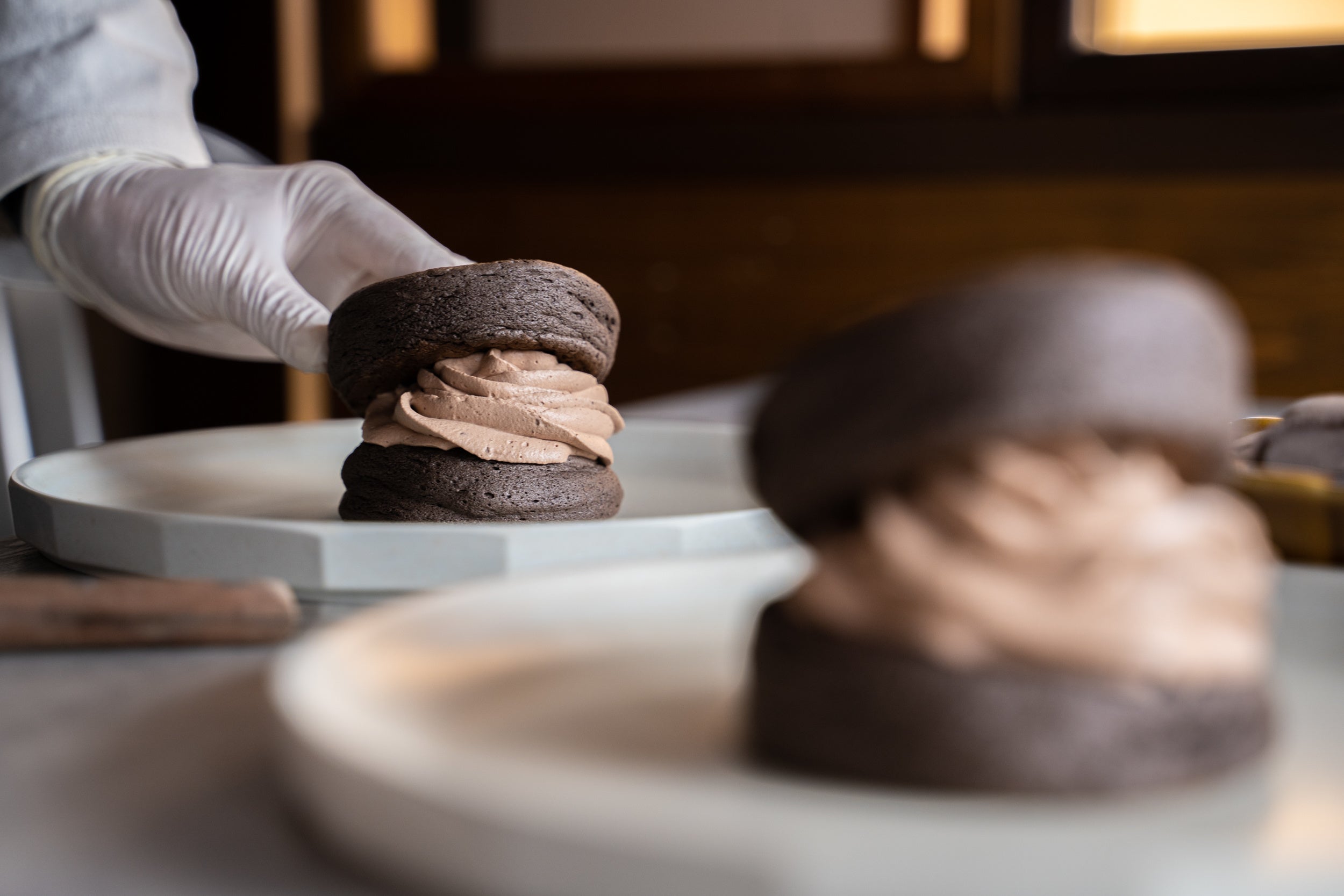 ひとつひとつ丁寧に焼き上げたショコラパンケーキをじっくりと寝かせ、手作業で作り上げる「ショコラどら焼き」=「ショコどら」