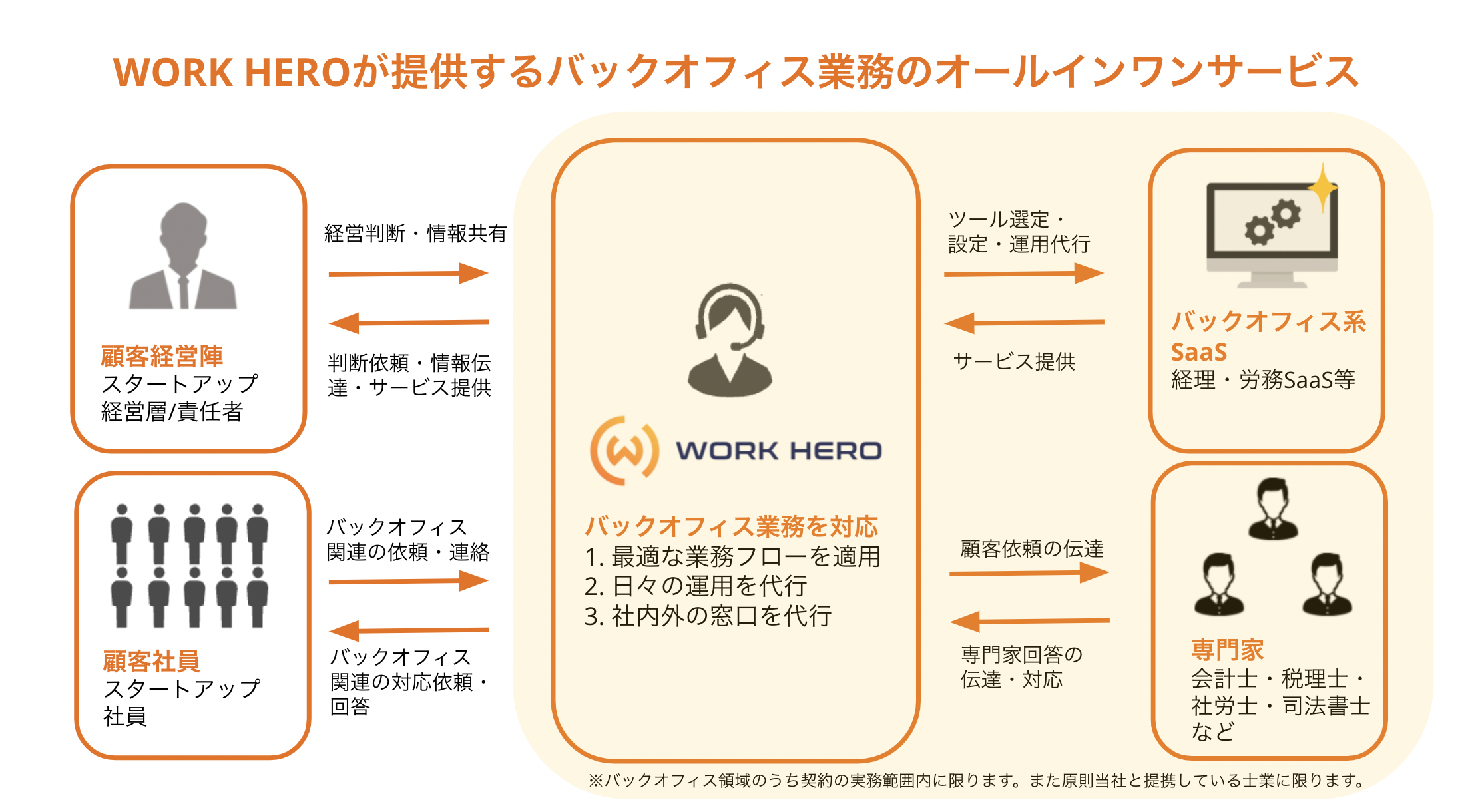 アーリーフェーズのスタートアップ経営者には、戦略策定、プロダクト開発、採用や組織づくり、営業、広報、資金調達や投資家対応など、やるべき業務は無数に存在します。そのような状況の中、事業や組織が拡大する過程で、さらに経理、労務、税務、総務など、バックオフィス関連の業務負担が増していき、経営者が時間やマインドシェアを大きく取られてしまう課題が生じています。WORK HEROはこうした課題の解決を目指し、事業を成長させるために必要な攻めの業務に、経営者・コアメンバーが最大限集中して自社の強みを活かすことができるよう、スタートアップのバックオフィス業務をオールインワンで引き受け、効率的に運用いたします。