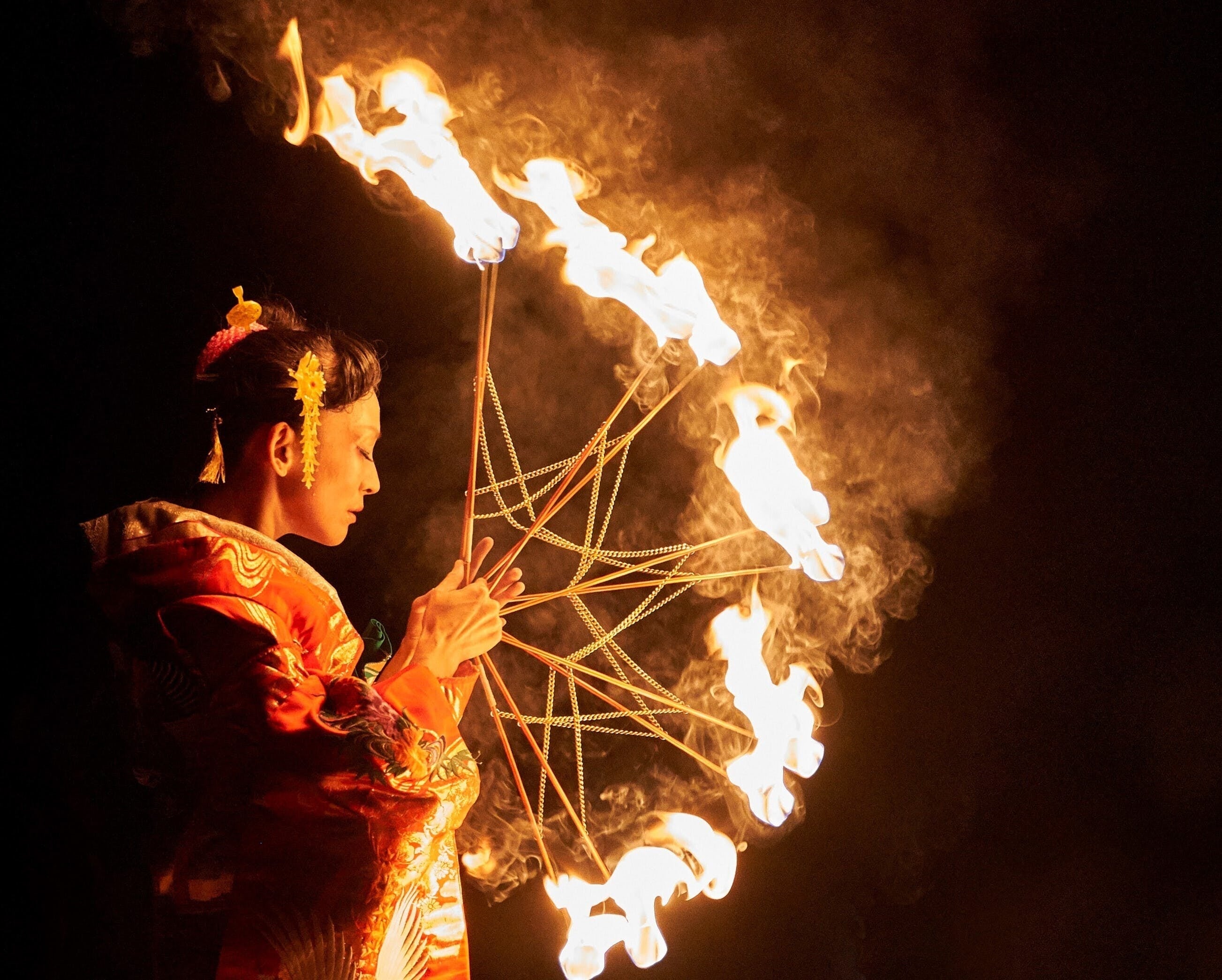 2004年よりtipi、そして広島の平和の火とともに各地で炎舞を開始。Fuji Rock等野外フェスの出演や、海外でのshowも経験。企業イベント、神事、企業への楽曲提供等活動の場を広げている。炎の息吹を伝達する炎舞師 酔月が白銀の中、光と闇を和合し、やすらぎと妖艶さに満ちた神秘的な炎舞で車山を彩る。