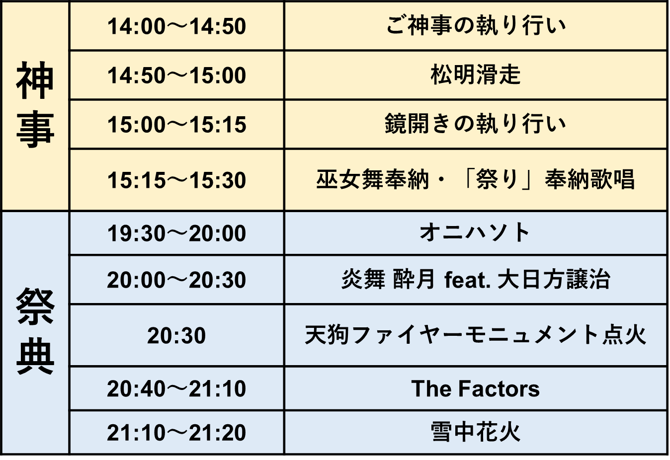 巫女舞の奉納、神職の祈祷、アーティストによる演奏、夜のゲレンデを明るく照らす松明スキー滑走などを実施予定。