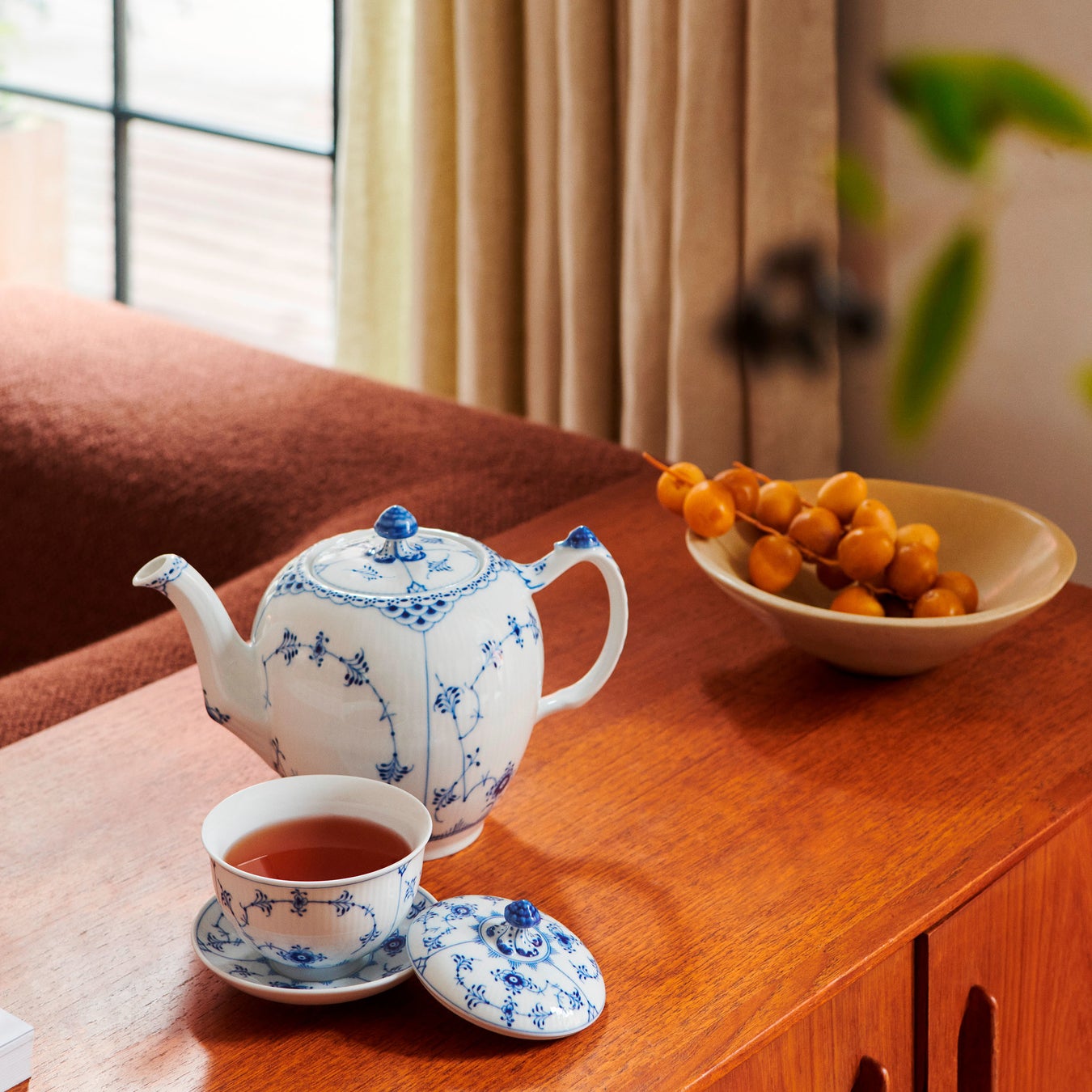 ブルーフルーテッド プレインのカップ&ソーサーに蓋がつき、小ぶりな美しい佇まいに一層の磨きがかかりました。お茶や花茶をはじめ、小さな椀として温かな椀物、蒸し物、煮物、御食事など、開けて香りを楽しむお料理にも最適です。