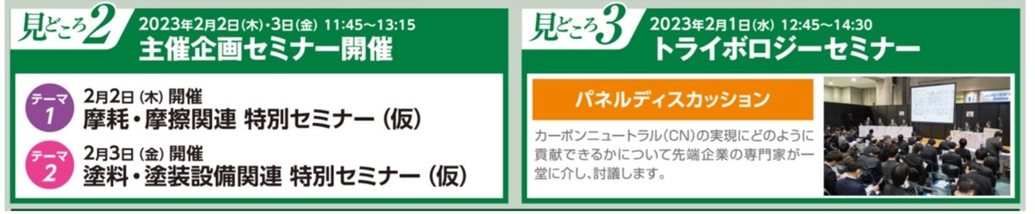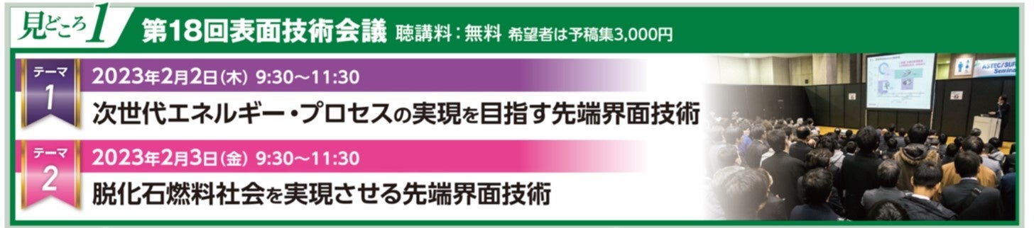 本展では各種表面分析・計測装置を中心に、最新のコーティング技術や装置、サービスや表面処理技術・加工装置から表面処理薬品、分析技術・サービス、周辺機器まで、表面・界面&表面処理加工・技術に携わるあらゆるモノとサービスが集結し、業界の課題解決を目指します。【2023セミナーの見どころ】