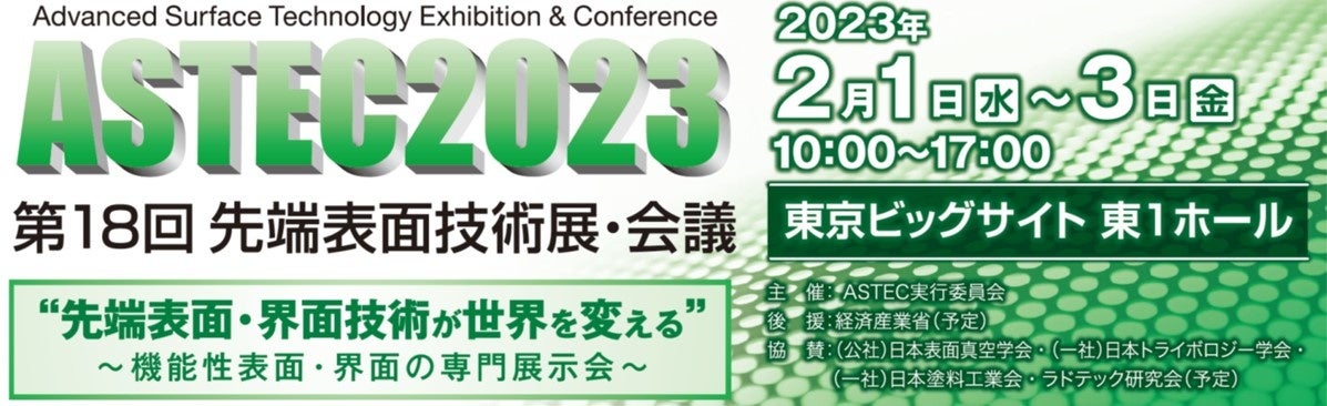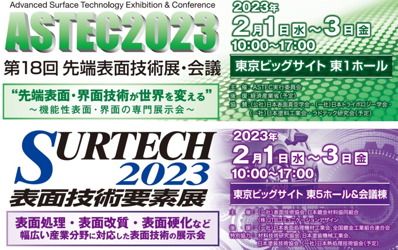 表面・界面科学で最先端表面処理ニーズに応える専門展と併催会議「ASTEC 2023 第18回先端表面技術展・会議」を主催するASTEC実行委員会と、めっき技術をはじめとした表面処理・表面改質の専門展「SURTECH2023 表面技術要素展」を主催するSURTECH実行委員会(一般社団法人表面技術協会/日本鍍金材料協同組合/株式会社コミュニケーションデザイン(以下、JCD))は、2023年2月1日(水)から2月3日(金)まで、東京ビッグサイト東ホールにて2つの専門展を同時開催します。