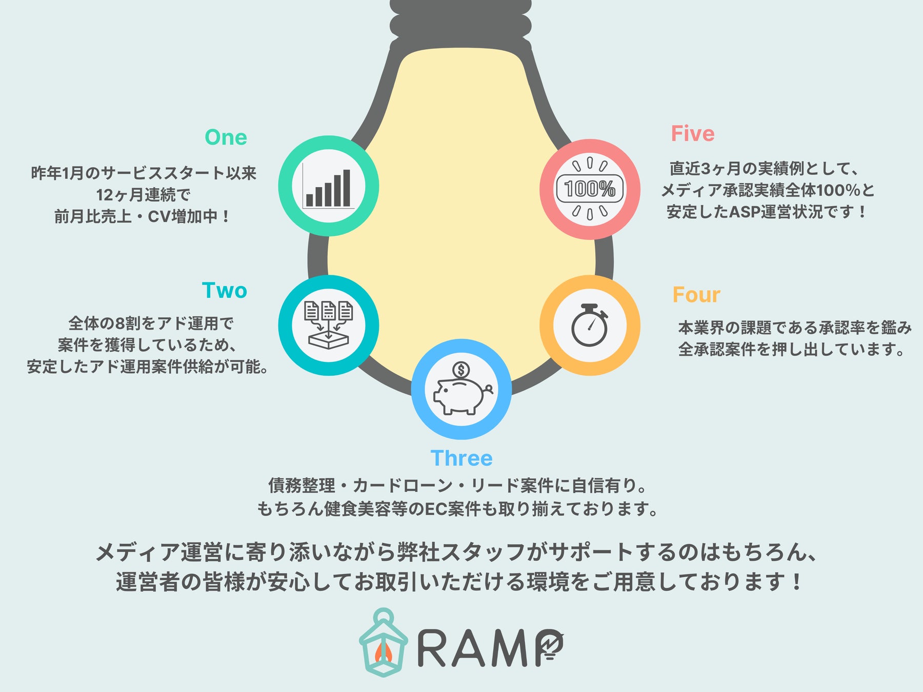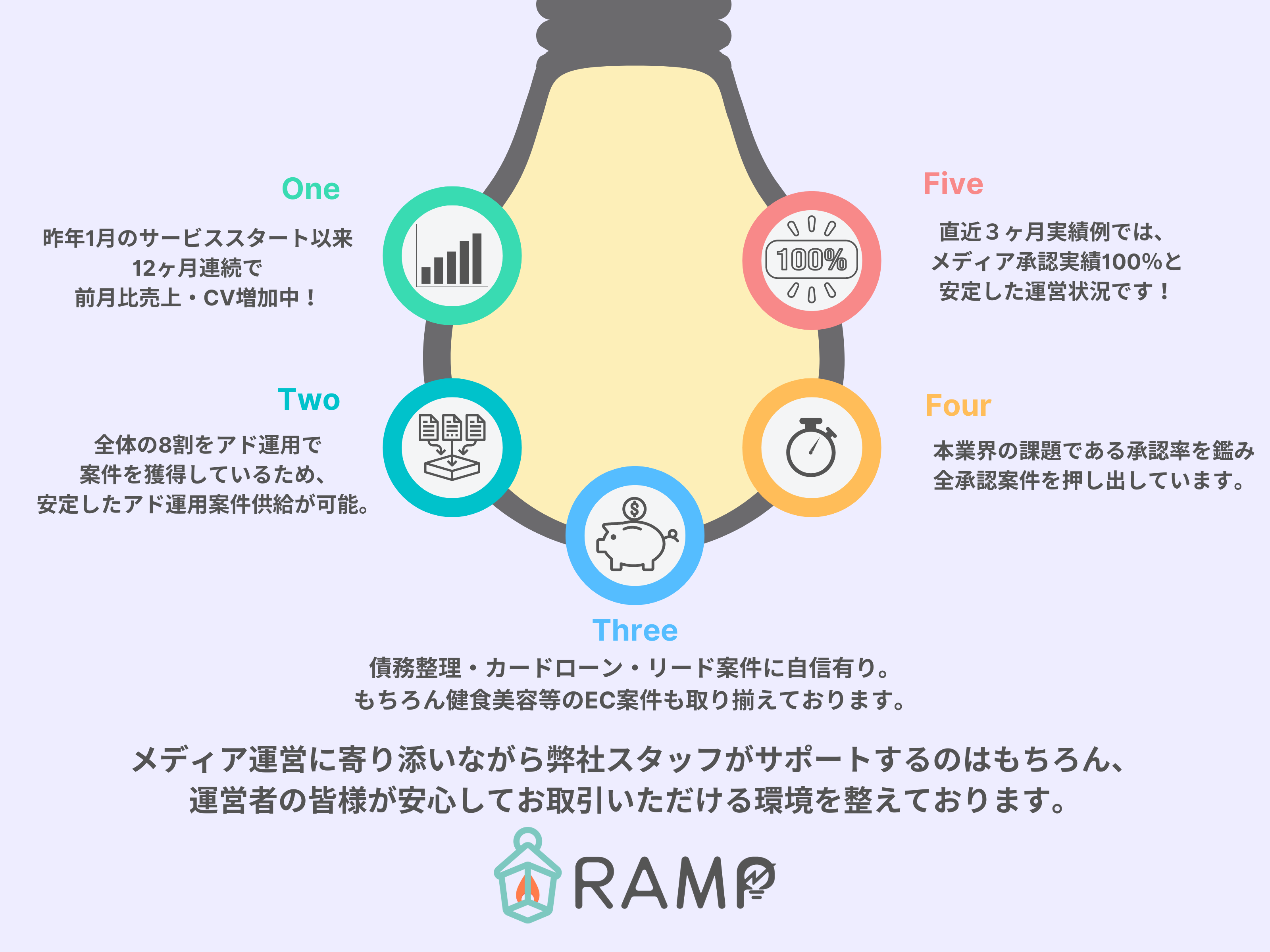 「RAMP」は、当社が展開する完全成果報酬型のアフィリエイト広告出稿サービスです。